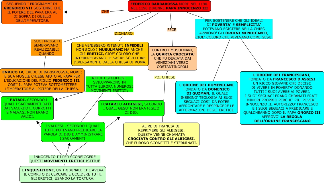 Questa Cmap, creata con IHMC CmapTools, contiene informazioni relative a: GLI ERETICI E L'ORDINI MENDICANTI, FEDERICO BARBAROSSA MORI' NEL 1190. NEL 1198 DIVENNE PAPA INNOCENZO III CHE SEGUENDO I PROGRAMMI DI GREGORIO VII SOSTENNE CHE IL POTERE DEL PAPA ERA AL DI SOPRA DI QUELLO DELL'IMPERATORE., FEDERICO BARBAROSSA MORI' NEL 1190. NEL 1198 DIVENNE PAPA INNOCENZO III PER SOSTENERE CHE GLI IDEALI DI POVERTA' E SEMPLICITA' POTEVANO ESISTERE NELLA CHIES APPROVO' GLI ORDINI MENDICANTI, CIOE' COLORO CHE VIVEVANO COME GESU' L'ORDINE DEI FRANCESCANI, FONDATO DA FRANCESCO D'ASSISI UN RICCO GIOVANE CHE DECISE DI VIVERE IN POVERTA' DONANDO TUTTI I SUOI AVERE AI POVERI. I SUOI SEGUACI ERANO CHIAMATI FRATI MINORI PROPRIO PERCHE' PIU' POVERI. INNOCENZO III AUTORIZZO' FRANCESCO E I SUOI SEGUACI A PREDICARE E QUALCHEANNO DOPO IL PAPA ONORIO III APPROVO' LA REGOLA DELL'ORDINE FRANCESCANO, FEDERICO BARBAROSSA MORI' NEL 1190. NEL 1198 DIVENNE PAPA INNOCENZO III FECE CONTRO I MUSULMANI, LA QUARTA CROCIATA; CHE FU DEVIATA DAI VENEZIANI VERSO COSTANTINOPOLI, FEDERICO BARBAROSSA MORI' NEL 1190. NEL 1198 DIVENNE PAPA INNOCENZO III I SUOI PROGETTI SEMBRAVANO REALIZZABILI QUANDO ENRICO IV, EREDE DI BARBAROSSA, MORI'; E SUA MOGLIE CHIESE AIUTO AL PAPA PER L'EDUCAZIONE DEL FIGLIO FEDERICO III. COSI' IL PAPA POTEVA SOTTOMETTERE L'IMPERATORE AL POTERE DELLA CHIESA., L'INQUISIZIONE, UN TRIBUNALE CHE AVEVA IL COMPITO DI CERCARE E UCCIDERE TUTTI GLI ERETICI, USANDO LA TORTURA. INNOCENZO III PER SCONFIGGERE QUESTI MOVIMENTI ERETICI ISTITUI' I CATARI O ALBIGESI, SECONDO I QUALI GESU' NON ERA FIGLIO DI DIO., CONTRO I MUSULMANI, LA QUARTA CROCIATA; CHE FU DEVIATA DAI VENEZIANI VERSO COSTANTINOPOLI POI CHIESE AL RE DI FRANCIA DI REPRIMERE GLI ALBIGESI, QUESTA VENNE CHIAMATA CROCIATA CONTRO GLI ALBIGESI, CHE FURONO SCONFITTI E STERMINATI., L'INQUISIZIONE, UN TRIBUNALE CHE AVEVA IL COMPITO DI CERCARE E UCCIDERE TUTTI GLI ERETICI, USANDO LA TORTURA. INNOCENZO III PER SCONFIGGERE QUESTI MOVIMENTI ERETICI ISTITUI' I PATARI, CECONDO I QUALI I SACRAMENTI DATI DAI SACERDOTI CORROTTI E MALVAGI NON ERANO VALIDI., L'INQUISIZIONE, UN TRIBUNALE CHE AVEVA IL COMPITO DI CERCARE E UCCIDERE TUTTI GLI ERETICI, USANDO LA TORTURA. INNOCENZO III PER SCONFIGGERE QUESTI MOVIMENTI ERETICI ISTITUI' I VALDESI , SECONDO I QUALI TUTTI POTEVANO PREDICARE LA PAROLA DI DIO E AMMINISTRARE I SACRAMENTI., CHE VENISSERO RITENUTI INFEDELI NON SOLO I MUSULMANI MA ANCHE GLI ERETICI, CIOE' COLORO CHE INTERPRETAVANO LE SACRE SCRITTURE DIVERSAMENTE DALLA CHIESA DI ROMA. NEL XII SECOLO SI SVILUPPARONO IN TUTTA EUROPA NUMEROSI MOVIMENTI ERETICI: I PATARI, CECONDO I QUALI I SACRAMENTI DATI DAI SACERDOTI CORROTTI E MALVAGI NON ERANO VALIDI., CHE VENISSERO RITENUTI INFEDELI NON SOLO I MUSULMANI MA ANCHE GLI ERETICI, CIOE' COLORO CHE INTERPRETAVANO LE SACRE SCRITTURE DIVERSAMENTE DALLA CHIESA DI ROMA. NEL XII SECOLO SI SVILUPPARONO IN TUTTA EUROPA NUMEROSI MOVIMENTI ERETICI: I VALDESI , SECONDO I QUALI TUTTI POTEVANO PREDICARE LA PAROLA DI DIO E AMMINISTRARE I SACRAMENTI., FEDERICO BARBAROSSA MORI' NEL 1190. NEL 1198 DIVENNE PAPA INNOCENZO III DICHIARO' CHE VENISSERO RITENUTI INFEDELI NON SOLO I MUSULMANI MA ANCHE GLI ERETICI, CIOE' COLORO CHE INTERPRETAVANO LE SACRE SCRITTURE DIVERSAMENTE DALLA CHIESA DI ROMA., CHE VENISSERO RITENUTI INFEDELI NON SOLO I MUSULMANI MA ANCHE GLI ERETICI, CIOE' COLORO CHE INTERPRETAVANO LE SACRE SCRITTURE DIVERSAMENTE DALLA CHIESA DI ROMA. NEL XII SECOLO SI SVILUPPARONO IN TUTTA EUROPA NUMEROSI MOVIMENTI ERETICI: I CATARI O ALBIGESI, SECONDO I QUALI GESU' NON ERA FIGLIO DI DIO., FEDERICO BARBAROSSA MORI' NEL 1190. NEL 1198 DIVENNE PAPA INNOCENZO III PER SOSTENERE CHE GLI IDEALI DI POVERTA' E SEMPLICITA' POTEVANO ESISTERE NELLA CHIES APPROVO' GLI ORDINI MENDICANTI, CIOE' COLORO CHE VIVEVANO COME GESU' L'ORDINE DEI DOMENICANI FONDATO DA DOMENICO DI GUZMAN, IL QUALE INSEGNO' TEOLOGIA AI SUOI SEGUACI COSI' DA POTER AFFRONTARE E RESPINGERE LE AFFERMAZIONI DEGLI ERETICI.