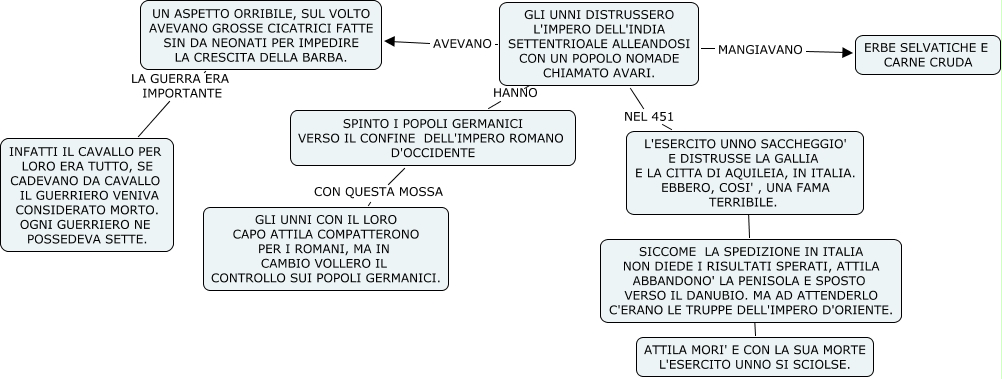Questa Cmap, creata con IHMC CmapTools, contiene informazioni relative a: GLI UNNI, UN ASPETTO ORRIBILE, SUL VOLTO AVEVANO GROSSE CICATRICI FATTE SIN DA NEONATI PER IMPEDIRE LA CRESCITA DELLA BARBA. LA GUERRA ERA IMPORTANTE INFATTI IL CAVALLO PER LORO ERA TUTTO, SE CADEVANO DA CAVALLO IL GUERRIERO VENIVA CONSIDERATO MORTO. OGNI GUERRIERO NE POSSEDEVA SETTE., SICCOME LA SPEDIZIONE IN ITALIA NON DIEDE I RISULTATI SPERATI, ATTILA ABBANDONO' LA PENISOLA E SPOSTO VERSO IL DANUBIO. MA AD ATTENDERLO C'ERANO LE TRUPPE DELL'IMPERO D'ORIENTE. ???? ATTILA MORI' E CON LA SUA MORTE L'ESERCITO UNNO SI SCIOLSE., SPINTO I POPOLI GERMANICI VERSO IL CONFINE DELL'IMPERO ROMANO D'OCCIDENTE CON QUESTA MOSSA GLI UNNI CON IL LORO CAPO ATTILA COMPATTERONO PER I ROMANI, MA IN CAMBIO VOLLERO IL CONTROLLO SUI POPOLI GERMANICI., GLI UNNI DISTRUSSERO L'IMPERO DELL'INDIA SETTENTRIOALE ALLEANDOSI CON UN POPOLO NOMADE CHIAMATO AVARI. MANGIAVANO ERBE SELVATICHE E CARNE CRUDA, GLI UNNI DISTRUSSERO L'IMPERO DELL'INDIA SETTENTRIOALE ALLEANDOSI CON UN POPOLO NOMADE CHIAMATO AVARI. HANNO SPINTO I POPOLI GERMANICI VERSO IL CONFINE DELL'IMPERO ROMANO D'OCCIDENTE, L'ESERCITO UNNO SACCHEGGIO' E DISTRUSSE LA GALLIA E LA CITTA DI AQUILEIA, IN ITALIA. EBBERO, COSI' , UNA FAMA TERRIBILE. ???? SICCOME LA SPEDIZIONE IN ITALIA NON DIEDE I RISULTATI SPERATI, ATTILA ABBANDONO' LA PENISOLA E SPOSTO VERSO IL DANUBIO. MA AD ATTENDERLO C'ERANO LE TRUPPE DELL'IMPERO D'ORIENTE., GLI UNNI DISTRUSSERO L'IMPERO DELL'INDIA SETTENTRIOALE ALLEANDOSI CON UN POPOLO NOMADE CHIAMATO AVARI. AVEVANO UN ASPETTO ORRIBILE, SUL VOLTO AVEVANO GROSSE CICATRICI FATTE SIN DA NEONATI PER IMPEDIRE LA CRESCITA DELLA BARBA., GLI UNNI DISTRUSSERO L'IMPERO DELL'INDIA SETTENTRIOALE ALLEANDOSI CON UN POPOLO NOMADE CHIAMATO AVARI. NEL 451 L'ESERCITO UNNO SACCHEGGIO' E DISTRUSSE LA GALLIA E LA CITTA DI AQUILEIA, IN ITALIA. EBBERO, COSI' , UNA FAMA TERRIBILE.