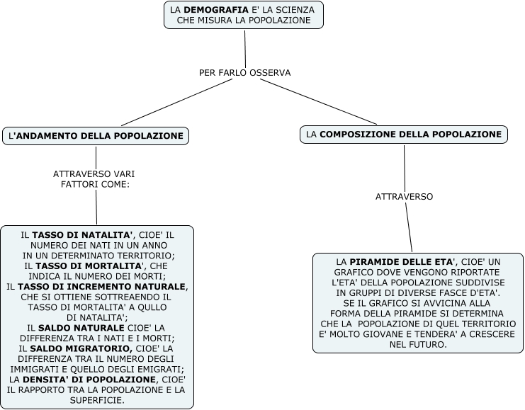Questa Cmap, creata con IHMC CmapTools, contiene informazioni relative a: LA DEMOGRAFIA, LA COMPOSIZIONE DELLA POPOLAZIONE ATTRAVERSO LA PIRAMIDE DELLE ETA', CIOE' UN GRAFICO DOVE VENGONO RIPORTATE L'ETA' DELLA POPOLAZIONE SUDDIVISE IN GRUPPI DI DIVERSE FASCE D'ETA'. SE IL GRAFICO SI AVVICINA ALLA FORMA DELLA PIRAMIDE SI DETERMINA CHE LA POPOLAZIONE DI QUEL TERRITORIO E' MOLTO GIOVANE E TENDERA' A CRESCERE NEL FUTURO., LA DEMOGRAFIA E' LA SCIENZA CHE MISURA LA POPOLAZIONE PER FARLO OSSERVA L'ANDAMENTO DELLA POPOLAZIONE, LA DEMOGRAFIA E' LA SCIENZA CHE MISURA LA POPOLAZIONE PER FARLO OSSERVA LA COMPOSIZIONE DELLA POPOLAZIONE, L'ANDAMENTO DELLA POPOLAZIONE ATTRAVERSO VARI FATTORI COME: IL TASSO DI NATALITA', CIOE' IL NUMERO DEI NATI IN UN ANNO IN UN DETERMINATO TERRITORIO; IL TASSO DI MORTALITA', CHE INDICA IL NUMERO DEI MORTI; IL TASSO DI INCREMENTO NATURALE, CHE SI OTTIENE SOTTREAENDO IL TASSO DI MORTALITA' A QULLO DI NATALITA'; IL SALDO NATURALE CIOE' LA DIFFERENZA TRA I NATI E I MORTI; IL SALDO MIGRATORIO, CIOE' LA DIFFERENZA TRA IL NUMERO DEGLI IMMIGRATI E QUELLO DEGLI EMIGRATI; LA DENSITA' DI POPOLAZIONE, CIOE' IL RAPPORTO TRA LA POPOLAZIONE E LA SUPERFICIE.