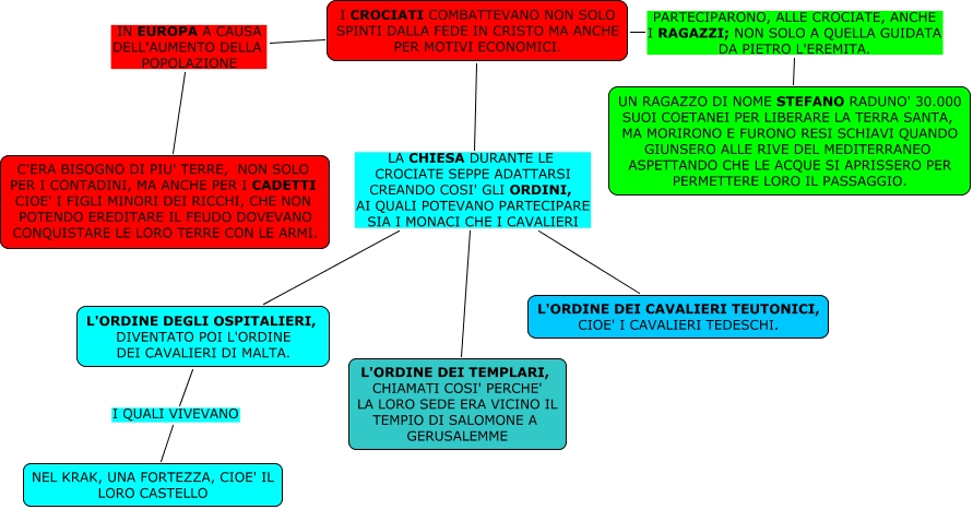 Questa Cmap, creata con IHMC CmapTools, contiene informazioni relative a: NUOVI ORDINI MONASTICI, L'ORDINE DEGLI OSPITALIERI, DIVENTATO POI L'ORDINE DEI CAVALIERI DI MALTA. I QUALI VIVEVANO NEL KRAK, UNA FORTEZZA, CIOE' IL LORO CASTELLO, I CROCIATI COMBATTEVANO NON SOLO SPINTI DALLA FEDE IN CRISTO MA ANCHE PER MOTIVI ECONOMICI. IN EUROPA A CAUSA DELL'AUMENTO DELLA POPOLAZIONE C'ERA BISOGNO DI PIU' TERRE, NON SOLO PER I CONTADINI, MA ANCHE PER I CADETTI CIOE' I FIGLI MINORI DEI RICCHI, CHE NON POTENDO EREDITARE IL FEUDO DOVEVANO CONQUISTARE LE LORO TERRE CON LE ARMI., I CROCIATI COMBATTEVANO NON SOLO SPINTI DALLA FEDE IN CRISTO MA ANCHE PER MOTIVI ECONOMICI. LA CHIESA DURANTE LE CROCIATE SEPPE ADATTARSI CREANDO COSI' GLI ORDINI, AI QUALI POTEVANO PARTECIPARE SIA I MONACI CHE I CAVALIERI L'ORDINE DEGLI OSPITALIERI, DIVENTATO POI L'ORDINE DEI CAVALIERI DI MALTA., I CROCIATI COMBATTEVANO NON SOLO SPINTI DALLA FEDE IN CRISTO MA ANCHE PER MOTIVI ECONOMICI. LA CHIESA DURANTE LE CROCIATE SEPPE ADATTARSI CREANDO COSI' GLI ORDINI, AI QUALI POTEVANO PARTECIPARE SIA I MONACI CHE I CAVALIERI L'ORDINE DEI TEMPLARI, CHIAMATI COSI' PERCHE' LA LORO SEDE ERA VICINO IL TEMPIO DI SALOMONE A GERUSALEMME, I CROCIATI COMBATTEVANO NON SOLO SPINTI DALLA FEDE IN CRISTO MA ANCHE PER MOTIVI ECONOMICI. PARTECIPARONO, ALLE CROCIATE, ANCHE I RAGAZZI; NON SOLO A QUELLA GUIDATA DA PIETRO L'EREMITA. UN RAGAZZO DI NOME STEFANO RADUNO' 30.000 SUOI COETANEI PER LIBERARE LA TERRA SANTA, MA MORIRONO E FURONO RESI SCHIAVI QUANDO GIUNSERO ALLE RIVE DEL MEDITERRANEO ASPETTANDO CHE LE ACQUE SI APRISSERO PER PERMETTERE LORO IL PASSAGGIO., I CROCIATI COMBATTEVANO NON SOLO SPINTI DALLA FEDE IN CRISTO MA ANCHE PER MOTIVI ECONOMICI. LA CHIESA DURANTE LE CROCIATE SEPPE ADATTARSI CREANDO COSI' GLI ORDINI, AI QUALI POTEVANO PARTECIPARE SIA I MONACI CHE I CAVALIERI L'ORDINE DEI CAVALIERI TEUTONICI, CIOE' I CAVALIERI TEDESCHI.
