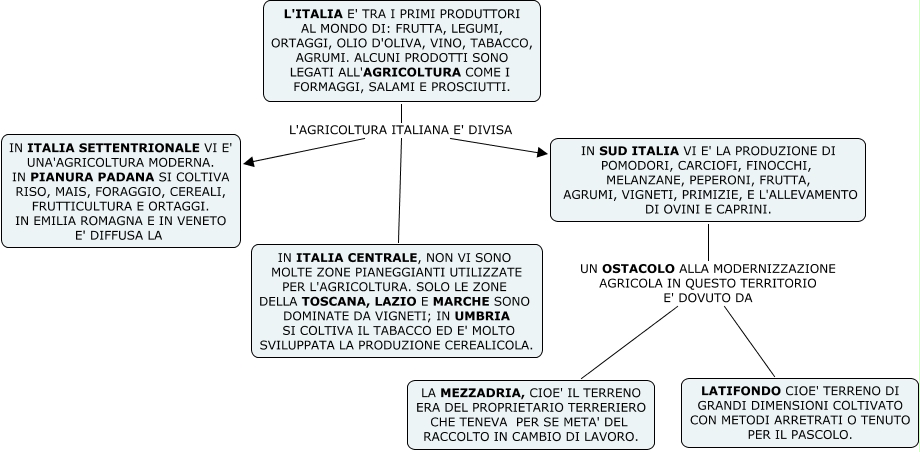 Questa Cmap, creata con IHMC CmapTools, contiene informazioni relative a: AGRICOLTURA ITALIANA, IN SUD ITALIA VI E' LA PRODUZIONE DI POMODORI, CARCIOFI, FINOCCHI, MELANZANE, PEPERONI, FRUTTA, AGRUMI, VIGNETI, PRIMIZIE, E L'ALLEVAMENTO DI OVINI E CAPRINI. UN OSTACOLO ALLA MODERNIZZAZIONE AGRICOLA IN QUESTO TERRITORIO E' DOVUTO DA LA MEZZADRIA, CIOE' IL TERRENO ERA DEL PROPRIETARIO TERRERIERO CHE TENEVA PER SE META' DEL RACCOLTO IN CAMBIO DI LAVORO., IN SUD ITALIA VI E' LA PRODUZIONE DI POMODORI, CARCIOFI, FINOCCHI, MELANZANE, PEPERONI, FRUTTA, AGRUMI, VIGNETI, PRIMIZIE, E L'ALLEVAMENTO DI OVINI E CAPRINI. UN OSTACOLO ALLA MODERNIZZAZIONE AGRICOLA IN QUESTO TERRITORIO E' DOVUTO DA LATIFONDO CIOE' TERRENO DI GRANDI DIMENSIONI COLTIVATO CON METODI ARRETRATI O TENUTO PER IL PASCOLO., L'ITALIA E' TRA I PRIMI PRODUTTORI AL MONDO DI: FRUTTA, LEGUMI, ORTAGGI, OLIO D'OLIVA, VINO, TABACCO, AGRUMI. ALCUNI PRODOTTI SONO LEGATI ALL'AGRICOLTURA COME I FORMAGGI, SALAMI E PROSCIUTTI. L'AGRICOLTURA ITALIANA E' DIVISA IN SUD ITALIA VI E' LA PRODUZIONE DI POMODORI, CARCIOFI, FINOCCHI, MELANZANE, PEPERONI, FRUTTA, AGRUMI, VIGNETI, PRIMIZIE, E L'ALLEVAMENTO DI OVINI E CAPRINI., L'ITALIA E' TRA I PRIMI PRODUTTORI AL MONDO DI: FRUTTA, LEGUMI, ORTAGGI, OLIO D'OLIVA, VINO, TABACCO, AGRUMI. ALCUNI PRODOTTI SONO LEGATI ALL'AGRICOLTURA COME I FORMAGGI, SALAMI E PROSCIUTTI. L'AGRICOLTURA ITALIANA E' DIVISA IN ITALIA SETTENTRIONALE VI E' UNA'AGRICOLTURA MODERNA. IN PIANURA PADANA SI COLTIVA RISO, MAIS, FORAGGIO, CEREALI, FRUTTICULTURA E ORTAGGI. IN EMILIA ROMAGNA E IN VENETO E' DIFFUSA LA, L'ITALIA E' TRA I PRIMI PRODUTTORI AL MONDO DI: FRUTTA, LEGUMI, ORTAGGI, OLIO D'OLIVA, VINO, TABACCO, AGRUMI. ALCUNI PRODOTTI SONO LEGATI ALL'AGRICOLTURA COME I FORMAGGI, SALAMI E PROSCIUTTI. L'AGRICOLTURA ITALIANA E' DIVISA IN ITALIA CENTRALE, NON VI SONO MOLTE ZONE PIANEGGIANTI UTILIZZATE PER L'AGRICOLTURA. SOLO LE ZONE DELLA TOSCANA, LAZIO E MARCHE SONO DOMINATE DA VIGNETI; IN UMBRIA SI COLTIVA IL TABACCO ED E' MOLTO SVILUPPATA LA PRODUZIONE CEREALICOLA.