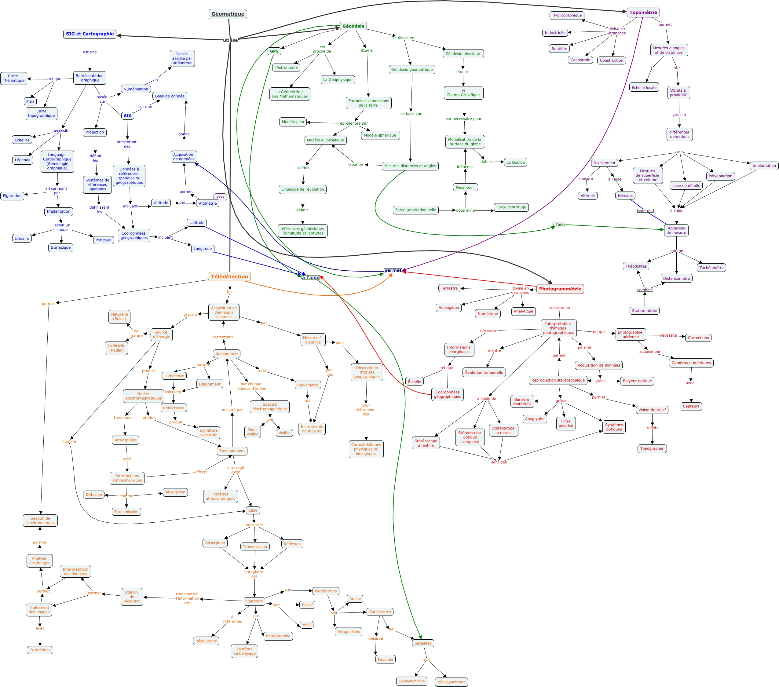 Cette carte de concepts créée avec IHMC CmapTools traite de: Géomatique TPI final, Mesures d'angles et de distances sur Objets à proximité, Interprétation d'images photographiques à l'aide de Stéréoscope optique complexe, le Champ Gravifique est nécessaire pour Modélisation de la surface du globe, Satellites soit Géosynchrone, Capteurs transmettre l'information vers Station de réception, Géodésie se divise en Géodésie physique, Appareils de mesure comme Tachéomètre, Mesures distances et angles création Modèle ellipsoïdique, Formes et dimensions de la terre représentée par Modèle ellipsoïdique, Reproduction stéréoscopique grâce Barrière matérielle, Acquisition de données donne Base de donnée, Capteurs sur Plateformes, photographie aérienne acquise par Caméras numériques, Modèle ellipsoïdique définit Ellipsoïde de révolution, Géodésie est proche de l'Astronomie, Implantation à l'aide Appareils de mesure, Mesures d'angles et de distances à Échelle locale, Éclairement calculant Réflectance, Mesures distances et angles à l'aide Appareils de mesure, Capteurs à différentes Résolutions