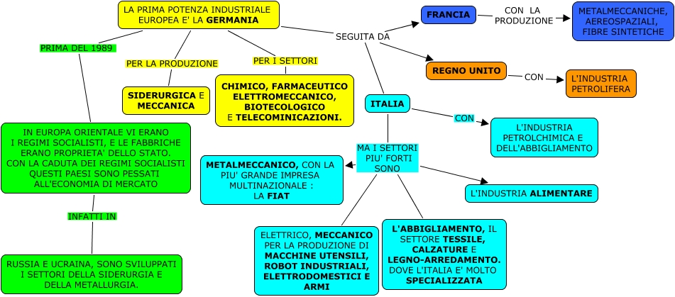 Questa Cmap, creata con IHMC CmapTools, contiene informazioni relative a: LE AREE INDUSTRIALI EUROPEE- L'INDUSTRIA ITALIANA, REGNO UNITO CON L'INDUSTRIA PETROLIFERA, ITALIA MA I SETTORI PIU' FORTI SONO L'INDUSTRIA ALIMENTARE, LA PRIMA POTENZA INDUSTRIALE EUROPEA E' LA GERMANIA SEGUITA DA REGNO UNITO, IN EUROPA ORIENTALE VI ERANO I REGIMI SOCIALISTI, E LE FABBRICHE ERANO PROPRIETA' DELLO STATO. CON LA CADUTA DEI REGIMI SOCIALISTI QUESTI PAESI SONO PESSATI ALL'ECONOMIA DI MERCATO INFATTI IN RUSSIA E UCRAINA, SONO SVILUPPATI I SETTORI DELLA SIDERURGIA E DELLA METALLURGIA., ITALIA MA I SETTORI PIU' FORTI SONO L'ABBIGLIAMENTO, IL SETTORE TESSILE, CALZATURE E LEGNO-ARREDAMENTO. DOVE L'ITALIA E' MOLTO SPECIALIZZATA, LA PRIMA POTENZA INDUSTRIALE EUROPEA E' LA GERMANIA PER LA PRODUZIONE SIDERURGICA E MECCANICA, LA PRIMA POTENZA INDUSTRIALE EUROPEA E' LA GERMANIA PER I SETTORI CHIMICO, FARMACEUTICO ELETTROMECCANICO, BIOTECOLOGICO E TELECOMINICAZIONI., ITALIA CON L'INDUSTRIA PETROLCHIMICA E DELL'ABBIGLIAMENTO, FRANCIA CON LA PRODUZIONE METALMECCANICHE, AEREOSPAZIALI, FIBRE SINTETICHE, LA PRIMA POTENZA INDUSTRIALE EUROPEA E' LA GERMANIA SEGUITA DA ITALIA, ITALIA MA I SETTORI PIU' FORTI SONO ELETTRICO, MECCANICO PER LA PRODUZIONE DI MACCHINE UTENSILI, ROBOT INDUSTRIALI, ELETTRODOMESTICI E ARMI, LA PRIMA POTENZA INDUSTRIALE EUROPEA E' LA GERMANIA SEGUITA DA FRANCIA, LA PRIMA POTENZA INDUSTRIALE EUROPEA E' LA GERMANIA PRIMA DEL 1989 IN EUROPA ORIENTALE VI ERANO I REGIMI SOCIALISTI, E LE FABBRICHE ERANO PROPRIETA' DELLO STATO. CON LA CADUTA DEI REGIMI SOCIALISTI QUESTI PAESI SONO PESSATI ALL'ECONOMIA DI MERCATO, ITALIA MA I SETTORI PIU' FORTI SONO METALMECCANICO, CON LA PIU' GRANDE IMPRESA MULTINAZIONALE : LA FIAT