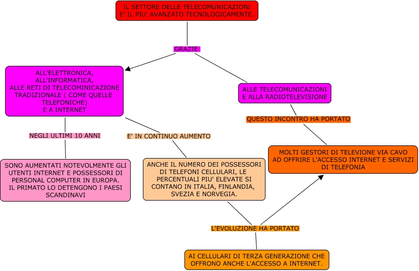 Questa Cmap, creata con IHMC CmapTools, contiene informazioni relative a: LE TELECOMUNICAZIONI, IL SETTORE DELLE TELECOMUNICAZIONI E' IL PIU' AVANZATO TECNOLOGICAMENTE. GRAZIE ALLE TELECOMUNICAZIONI E ALLA RADIOTELEVISIONE, ALLE TELECOMUNICAZIONI E ALLA RADIOTELEVISIONE QUESTO INCONTRO HA PORTATO MOLTI GESTORI DI TELEVIONE VIA CAVO AD OFFRIRE L'ACCESSO INTERNET E SERVIZI DI TELEFONIA, ALL'ELETTRONICA, ALL'INFORMATICA, ALLE RETI DI TELECOMINICAZIONE TRADIZIONALE ( COME QUELLE TELEFONICHE) E A INTERNET NEGLI ULTIMI 10 ANNI SONO AUMENTATI NOTEVOLMENTE GLI UTENTI INTERNET E POSSESSORI DI PERSONAL COMPUTER IN EUROPA. IL PRIMATO LO DETENGONO I PAESI SCANDINAVI, ANCHE IL NUMERO DEI POSSESSORI DI TELEFONI CELLULARI, LE PERCENTUALI PIU' ELEVATE SI CONTANO IN ITALIA, FINLANDIA, SVEZIA E NORVEGIA. L'EVOLUZIONE HA PORTATO MOLTI GESTORI DI TELEVIONE VIA CAVO AD OFFRIRE L'ACCESSO INTERNET E SERVIZI DI TELEFONIA, ANCHE IL NUMERO DEI POSSESSORI DI TELEFONI CELLULARI, LE PERCENTUALI PIU' ELEVATE SI CONTANO IN ITALIA, FINLANDIA, SVEZIA E NORVEGIA. L'EVOLUZIONE HA PORTATO AI CELLULARI DI TERZA GENERAZIONE CHE OFFRONO ANCHE L'ACCESSO A INTERNET., ALL'ELETTRONICA, ALL'INFORMATICA, ALLE RETI DI TELECOMINICAZIONE TRADIZIONALE ( COME QUELLE TELEFONICHE) E A INTERNET E' IN CONTINUO AUMENTO ANCHE IL NUMERO DEI POSSESSORI DI TELEFONI CELLULARI, LE PERCENTUALI PIU' ELEVATE SI CONTANO IN ITALIA, FINLANDIA, SVEZIA E NORVEGIA., IL SETTORE DELLE TELECOMUNICAZIONI E' IL PIU' AVANZATO TECNOLOGICAMENTE. GRAZIE ALL'ELETTRONICA, ALL'INFORMATICA, ALLE RETI DI TELECOMINICAZIONE TRADIZIONALE ( COME QUELLE TELEFONICHE) E A INTERNET