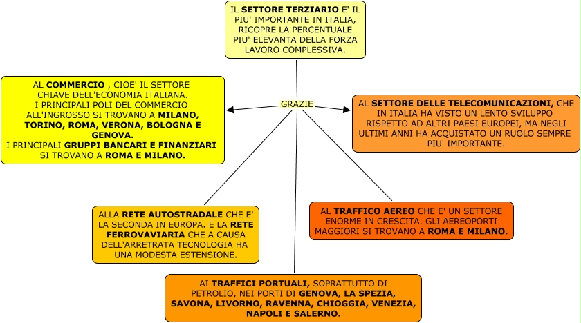 Questa Cmap, creata con IHMC CmapTools, contiene informazioni relative a: COMMERCIO, TRASPORTI E COMUNICAZIONI IN ITALIA, IL SETTORE TERZIARIO E' IL PIU' IMPORTANTE IN ITALIA, RICOPRE LA PERCENTUALE PIU' ELEVANTA DELLA FORZA LAVORO COMPLESSIVA. GRAZIE AL COMMERCIO , CIOE' IL SETTORE CHIAVE DELL'ECONOMIA ITALIANA. I PRINCIPALI POLI DEL COMMERCIO ALL'INGROSSO SI TROVANO A MILANO, TORINO, ROMA, VERONA, BOLOGNA E GENOVA. I PRINCIPALI GRUPPI BANCARI E FINANZIARI SI TROVANO A ROMA E MILANO., IL SETTORE TERZIARIO E' IL PIU' IMPORTANTE IN ITALIA, RICOPRE LA PERCENTUALE PIU' ELEVANTA DELLA FORZA LAVORO COMPLESSIVA. GRAZIE AI TRAFFICI PORTUALI, SOPRATTUTTO DI PETROLIO, NEI PORTI DI GENOVA, LA SPEZIA, SAVONA, LIVORNO, RAVENNA, CHIOGGIA, VENEZIA, NAPOLI E SALERNO., IL SETTORE TERZIARIO E' IL PIU' IMPORTANTE IN ITALIA, RICOPRE LA PERCENTUALE PIU' ELEVANTA DELLA FORZA LAVORO COMPLESSIVA. GRAZIE AL SETTORE DELLE TELECOMUNICAZIONI, CHE IN ITALIA HA VISTO UN LENTO SVILUPPO RISPETTO AD ALTRI PAESI EUROPEI, MA NEGLI ULTIMI ANNI HA ACQUISTATO UN RUOLO SEMPRE PIU' IMPORTANTE., IL SETTORE TERZIARIO E' IL PIU' IMPORTANTE IN ITALIA, RICOPRE LA PERCENTUALE PIU' ELEVANTA DELLA FORZA LAVORO COMPLESSIVA. GRAZIE ALLA RETE AUTOSTRADALE CHE E' LA SECONDA IN EUROPA. E LA RETE FERROVAVIARIA CHE A CAUSA DELL'ARRETRATA TECNOLOGIA HA UNA MODESTA ESTENSIONE., IL SETTORE TERZIARIO E' IL PIU' IMPORTANTE IN ITALIA, RICOPRE LA PERCENTUALE PIU' ELEVANTA DELLA FORZA LAVORO COMPLESSIVA. GRAZIE AL TRAFFICO AEREO CHE E' UN SETTORE ENORME IN CRESCITA. GLI AEREOPORTI MAGGIORI SI TROVANO A ROMA E MILANO.