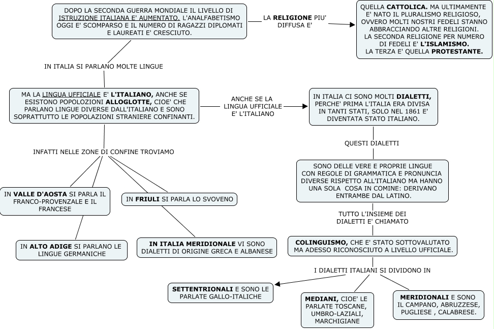 Questa Cmap, creata con IHMC CmapTools, contiene informazioni relative a: LE CARATTERISTICHE DEGLI ITALIANI, MA LA LINGUA UFFICIALE E' L'ITALIANO, ANCHE SE ESISTONO POPOLOZIONI ALLOGLOTTE, CIOE' CHE PARLANO LINGUE DIVERSE DALL'ITALIANO E SONO SOPRATTUTTO LE POPOLAZIONI STRANIERE CONFINANTI. INFATTI NELLE ZONE DI CONFINE TROVIAMO IN VALLE D'AOSTA SI PARLA IL FRANCO-PROVENZALE E IL FRANCESE, DOPO LA SECONDA GUERRA MONDIALE IL LIVELLO DI ISTRUZIONE ITALIANA E' AUMENTATO. L'ANALFABETISMO OGGI E' SCOMPARSO E IL NUMERO DI RAGAZZI DIPLOMATI E LAUREATI E' CRESCIUTO. IN ITALIA SI PARLANO MOLTE LINGUE MA LA LINGUA UFFICIALE E' L'ITALIANO, ANCHE SE ESISTONO POPOLOZIONI ALLOGLOTTE, CIOE' CHE PARLANO LINGUE DIVERSE DALL'ITALIANO E SONO SOPRATTUTTO LE POPOLAZIONI STRANIERE CONFINANTI., MA LA LINGUA UFFICIALE E' L'ITALIANO, ANCHE SE ESISTONO POPOLOZIONI ALLOGLOTTE, CIOE' CHE PARLANO LINGUE DIVERSE DALL'ITALIANO E SONO SOPRATTUTTO LE POPOLAZIONI STRANIERE CONFINANTI. ANCHE SE LA LINGUA UFFICIALE E' L'ITALIANO IN ITALIA CI SONO MOLTI DIALETTI, PERCHE' PRIMA L'ITALIA ERA DIVISA IN TANTI STATI, SOLO NEL 1861 E' DIVENTATA STATO ITALIANO., DOPO LA SECONDA GUERRA MONDIALE IL LIVELLO DI ISTRUZIONE ITALIANA E' AUMENTATO. L'ANALFABETISMO OGGI E' SCOMPARSO E IL NUMERO DI RAGAZZI DIPLOMATI E LAUREATI E' CRESCIUTO. LA RELIGIONE PIU' DIFFUSA E' QUELLA CATTOLICA. MA ULTIMAMENTE E' NATO IL PLURALISMO RELIGIOSO, OVVERO MOLTI NOSTRI FEDELI STANNO ABBRACCIANDO ALTRE RELIGIONI. LA SECONDA RELIGIONE PER NUMERO DI FEDELI E' L'ISLAMISMO. LA TERZA E' QUELLA PROTESTANTE., MA LA LINGUA UFFICIALE E' L'ITALIANO, ANCHE SE ESISTONO POPOLOZIONI ALLOGLOTTE, CIOE' CHE PARLANO LINGUE DIVERSE DALL'ITALIANO E SONO SOPRATTUTTO LE POPOLAZIONI STRANIERE CONFINANTI. INFATTI NELLE ZONE DI CONFINE TROVIAMO IN ITALIA MERIDIONALE VI SONO DIALETTI DI ORIGINE GRECA E ALBANESE, SONO DELLE VERE E PROPRIE LINGUE CON REGOLE DI GRAMMATICA E PRONUNCIA DIVERSE RISPETTO ALL'ITALIANO MA HANNO UNA SOLA COSA IN COMINE: DERIVANO ENTRAMBE DAL LATINO. TUTTO L'INSIEME DEI DIALETTI E' CHIAMATO COLINGUISMO, CHE E' STATO SOTTOVALUTATO MA ADESSO RICONOSCIUTO A LIVELLO UFFICIALE., MA LA LINGUA UFFICIALE E' L'ITALIANO, ANCHE SE ESISTONO POPOLOZIONI ALLOGLOTTE, CIOE' CHE PARLANO LINGUE DIVERSE DALL'ITALIANO E SONO SOPRATTUTTO LE POPOLAZIONI STRANIERE CONFINANTI. INFATTI NELLE ZONE DI CONFINE TROVIAMO IN ALTO ADIGE SI PARLANO LE LINGUE GERMANICHE, COLINGUISMO, CHE E' STATO SOTTOVALUTATO MA ADESSO RICONOSCIUTO A LIVELLO UFFICIALE. I DIALETTI ITALIANI SI DIVIDONO IN MEDIANI, CIOE' LE PARLATE TOSCANE, UMBRO-LAZIALI, MARCHIGIANE, IN ITALIA CI SONO MOLTI DIALETTI, PERCHE' PRIMA L'ITALIA ERA DIVISA IN TANTI STATI, SOLO NEL 1861 E' DIVENTATA STATO ITALIANO. QUESTI DIALETTI SONO DELLE VERE E PROPRIE LINGUE CON REGOLE DI GRAMMATICA E PRONUNCIA DIVERSE RISPETTO ALL'ITALIANO MA HANNO UNA SOLA COSA IN COMINE: DERIVANO ENTRAMBE DAL LATINO., COLINGUISMO, CHE E' STATO SOTTOVALUTATO MA ADESSO RICONOSCIUTO A LIVELLO UFFICIALE. I DIALETTI ITALIANI SI DIVIDONO IN MERIDIONALI E SONO IL CAMPANO, ABRUZZESE, PUGLIESE , CALABRESE., COLINGUISMO, CHE E' STATO SOTTOVALUTATO MA ADESSO RICONOSCIUTO A LIVELLO UFFICIALE. I DIALETTI ITALIANI SI DIVIDONO IN SETTENTRIONALI E SONO LE PARLATE GALLO-ITALICHE, MA LA LINGUA UFFICIALE E' L'ITALIANO, ANCHE SE ESISTONO POPOLOZIONI ALLOGLOTTE, CIOE' CHE PARLANO LINGUE DIVERSE DALL'ITALIANO E SONO SOPRATTUTTO LE POPOLAZIONI STRANIERE CONFINANTI. INFATTI NELLE ZONE DI CONFINE TROVIAMO IN FRIULI SI PARLA LO SVOVENO