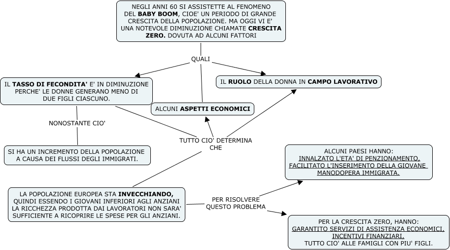 Questa Cmap, creata con IHMC CmapTools, contiene informazioni relative a: COME CAMBIA LA POPOLAZIONE EUROPEA, LA POPOLAZIONE EUROPEA STA INVECCHIANDO, QUINDI ESSENDO I GIOVANI INFERIORI AGLI ANZIANI LA RICCHEZZA PRODOTTA DAI LAVORATORI NON SARA' SUFFICIENTE A RICOPRIRE LE SPESE PER GLI ANZIANI. PER RISOLVERE QUESTO PROBLEMA ALCUNI PAESI HANNO: INNALZATO L'ETA' DI PENZIONAMENTO, FACILITATO L'INSERIMENTO DELLA GIOVANE MANODOPERA IMMIGRATA., LA POPOLAZIONE EUROPEA STA INVECCHIANDO, QUINDI ESSENDO I GIOVANI INFERIORI AGLI ANZIANI LA RICCHEZZA PRODOTTA DAI LAVORATORI NON SARA' SUFFICIENTE A RICOPRIRE LE SPESE PER GLI ANZIANI. PER RISOLVERE QUESTO PROBLEMA PER LA CRESCITA ZERO, HANNO: GARANTITO SERVIZI DI ASSISTENZA ECONOMICI, INCENTIVI FINANZIARI, TUTTO CIO' ALLE FAMIGLI CON PIU' FIGLI., IL TASSO DI FECONDITA' E' IN DIMINUZIONE PERCHE' LE DONNE GENERANO MENO DI DUE FIGLI CIASCUNO. TUTTO CIO' DETERMINA CHE IL RUOLO DELLA DONNA IN CAMPO LAVORATIVO, NEGLI ANNI 60 SI ASSISTETTE AL FENOMENO DEL BABY BOOM, CIOE' UN PERIODO DI GRANDE CRESCITA DELLA POPOLAZIONE. MA OGGI VI E' UNA NOTEVOLE DIMINUZIONE CHIAMATE CRESCITA ZERO. DOVUTA AD ALCUNI FATTORI QUALI IL TASSO DI FECONDITA' E' IN DIMINUZIONE PERCHE' LE DONNE GENERANO MENO DI DUE FIGLI CIASCUNO., NEGLI ANNI 60 SI ASSISTETTE AL FENOMENO DEL BABY BOOM, CIOE' UN PERIODO DI GRANDE CRESCITA DELLA POPOLAZIONE. MA OGGI VI E' UNA NOTEVOLE DIMINUZIONE CHIAMATE CRESCITA ZERO. DOVUTA AD ALCUNI FATTORI QUALI ALCUNI ASPETTI ECONOMICI, NEGLI ANNI 60 SI ASSISTETTE AL FENOMENO DEL BABY BOOM, CIOE' UN PERIODO DI GRANDE CRESCITA DELLA POPOLAZIONE. MA OGGI VI E' UNA NOTEVOLE DIMINUZIONE CHIAMATE CRESCITA ZERO. DOVUTA AD ALCUNI FATTORI QUALI IL RUOLO DELLA DONNA IN CAMPO LAVORATIVO, IL TASSO DI FECONDITA' E' IN DIMINUZIONE PERCHE' LE DONNE GENERANO MENO DI DUE FIGLI CIASCUNO. TUTTO CIO' DETERMINA CHE LA POPOLAZIONE EUROPEA STA INVECCHIANDO, QUINDI ESSENDO I GIOVANI INFERIORI AGLI ANZIANI LA RICCHEZZA PRODOTTA DAI LAVORATORI NON SARA' SUFFICIENTE A RICOPRIRE LE SPESE PER GLI ANZIANI., IL TASSO DI FECONDITA' E' IN DIMINUZIONE PERCHE' LE DONNE GENERANO MENO DI DUE FIGLI CIASCUNO. NONOSTANTE CIO' SI HA UN INCREMENTO DELLA POPOLAZIONE A CAUSA DEI FLUSSI DEGLI IMMIGRATI., IL TASSO DI FECONDITA' E' IN DIMINUZIONE PERCHE' LE DONNE GENERANO MENO DI DUE FIGLI CIASCUNO. TUTTO CIO' DETERMINA CHE ALCUNI ASPETTI ECONOMICI