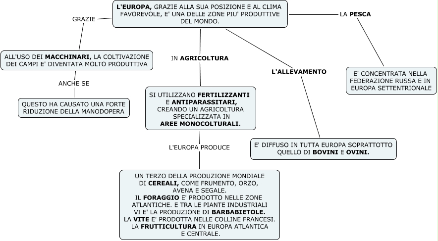 Questa Cmap, creata con IHMC CmapTools, contiene informazioni relative a: L'AGRICOLTURA EUROPEA, ALL'USO DEI MACCHINARI, LA COLTIVAZIONE DEI CAMPI E' DIVENTATA MOLTO PRODUTTIVA ANCHE SE QUESTO HA CAUSATO UNA FORTE RIDUZIONE DELLA MANODOPERA, SI UTILIZZANO FERTILIZZANTI E ANTIPARASSITARI, CREANDO UN AGRICOLTURA SPECIALIZZATA IN AREE MONOCOLTURALI. L'EUROPA PRODUCE UN TERZO DELLA PRODUZIONE MONDIALE DI CEREALI, COME FRUMENTO, ORZO, AVENA E SEGALE. IL FORAGGIO E' PRODOTTO NELLE ZONE ATLANTICHE. E TRA LE PIANTE INDUSTRIALI VI E' LA PRODUZIONE DI BARBABIETOLE. LA VITE E' PRODOTTA NELLE COLLINE FRANCESI. LA FRUTTICULTURA IN EUROPA ATLANTICA E CENTRALE., L'EUROPA, GRAZIE ALLA SUA POSIZIONE E AL CLIMA FAVOREVOLE, E' UNA DELLE ZONE PIU' PRODUTTIVE DEL MONDO. LA PESCA E' CONCENTRATA NELLA FEDERAZIONE RUSSA E IN EUROPA SETTENTRIONALE, L'EUROPA, GRAZIE ALLA SUA POSIZIONE E AL CLIMA FAVOREVOLE, E' UNA DELLE ZONE PIU' PRODUTTIVE DEL MONDO. IN AGRICOLTURA SI UTILIZZANO FERTILIZZANTI E ANTIPARASSITARI, CREANDO UN AGRICOLTURA SPECIALIZZATA IN AREE MONOCOLTURALI., L'EUROPA, GRAZIE ALLA SUA POSIZIONE E AL CLIMA FAVOREVOLE, E' UNA DELLE ZONE PIU' PRODUTTIVE DEL MONDO. GRAZIE ALL'USO DEI MACCHINARI, LA COLTIVAZIONE DEI CAMPI E' DIVENTATA MOLTO PRODUTTIVA, L'EUROPA, GRAZIE ALLA SUA POSIZIONE E AL CLIMA FAVOREVOLE, E' UNA DELLE ZONE PIU' PRODUTTIVE DEL MONDO. L'ALLEVAMENTO E' DIFFUSO IN TUTTA EUROPA SOPRATTOTTO QUELLO DI BOVINI E OVINI.