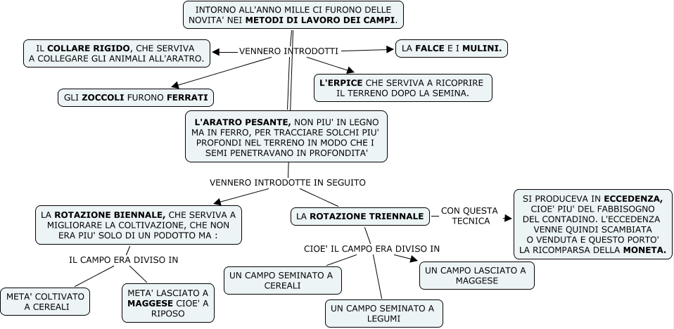Questa Cmap, creata con IHMC CmapTools, contiene informazioni relative a: LO SVILUPPO AGRICOLO, LA ROTAZIONE TRIENNALE CON QUESTA TECNICA SI PRODUCEVA IN ECCEDENZA, CIOE' PIU' DEL FABBISOGNO DEL CONTADINO. L'ECCEDENZA VENNE QUINDI SCAMBIATA O VENDUTA E QUESTO PORTO' LA RICOMPARSA DELLA MONETA., INTORNO ALL'ANNO MILLE CI FURONO DELLE NOVITA' NEI METODI DI LAVORO DEI CAMPI. VENNERO INTRODOTTI GLI ZOCCOLI FURONO FERRATI, INTORNO ALL'ANNO MILLE CI FURONO DELLE NOVITA' NEI METODI DI LAVORO DEI CAMPI. VENNERO INTRODOTTI L'ERPICE CHE SERVIVA A RICOPRIRE IL TERRENO DOPO LA SEMINA., INTORNO ALL'ANNO MILLE CI FURONO DELLE NOVITA' NEI METODI DI LAVORO DEI CAMPI. VENNERO INTRODOTTI L'ARATRO PESANTE, NON PIU' IN LEGNO MA IN FERRO, PER TRACCIARE SOLCHI PIU' PROFONDI NEL TERRENO IN MODO CHE I SEMI PENETRAVANO IN PROFONDITA', INTORNO ALL'ANNO MILLE CI FURONO DELLE NOVITA' NEI METODI DI LAVORO DEI CAMPI. VENNERO INTRODOTTI LA FALCE E I MULINI., LA ROTAZIONE TRIENNALE CIOE' IL CAMPO ERA DIVISO IN UN CAMPO SEMINATO A LEGUMI, INTORNO ALL'ANNO MILLE CI FURONO DELLE NOVITA' NEI METODI DI LAVORO DEI CAMPI. VENNERO INTRODOTTE IN SEGUITO LA ROTAZIONE TRIENNALE, LA ROTAZIONE TRIENNALE CIOE' IL CAMPO ERA DIVISO IN UN CAMPO LASCIATO A MAGGESE, LA ROTAZIONE BIENNALE, CHE SERVIVA A MIGLIORARE LA COLTIVAZIONE, CHE NON ERA PIU' SOLO DI UN PODOTTO MA : IL CAMPO ERA DIVISO IN META' COLTIVATO A CEREALI, LA ROTAZIONE TRIENNALE CIOE' IL CAMPO ERA DIVISO IN UN CAMPO SEMINATO A CEREALI, INTORNO ALL'ANNO MILLE CI FURONO DELLE NOVITA' NEI METODI DI LAVORO DEI CAMPI. VENNERO INTRODOTTE IN SEGUITO LA ROTAZIONE BIENNALE, CHE SERVIVA A MIGLIORARE LA COLTIVAZIONE, CHE NON ERA PIU' SOLO DI UN PODOTTO MA :, INTORNO ALL'ANNO MILLE CI FURONO DELLE NOVITA' NEI METODI DI LAVORO DEI CAMPI. VENNERO INTRODOTTI IL COLLARE RIGIDO, CHE SERVIVA A COLLEGARE GLI ANIMALI ALL'ARATRO., LA ROTAZIONE BIENNALE, CHE SERVIVA A MIGLIORARE LA COLTIVAZIONE, CHE NON ERA PIU' SOLO DI UN PODOTTO MA : IL CAMPO ERA DIVISO IN META' LASCIATO A MAGGESE CIOE' A RIPOSO