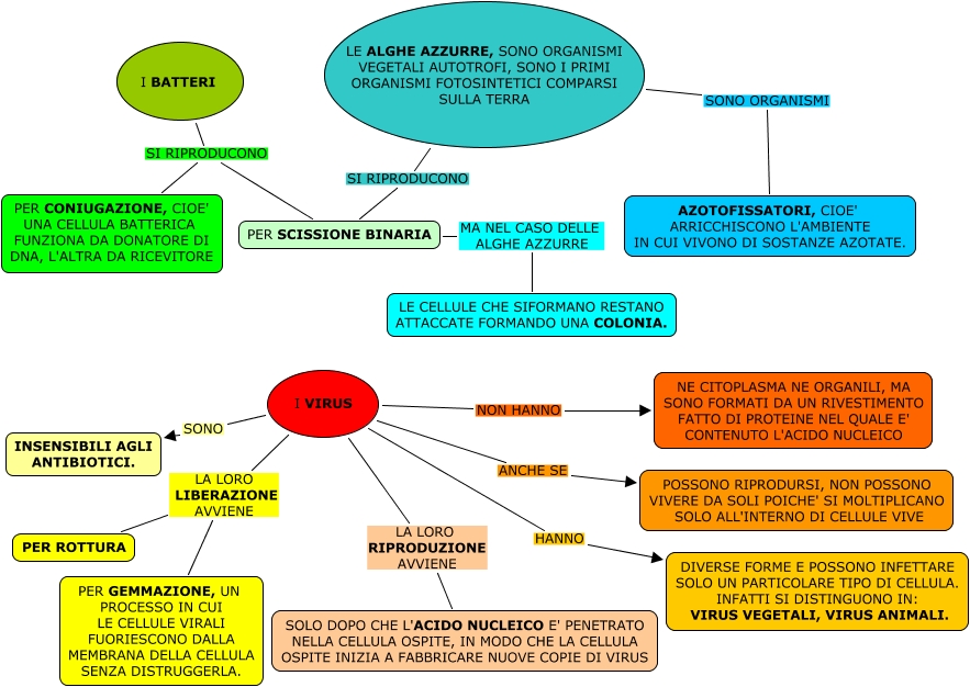 Questa Cmap, creata con IHMC CmapTools, contiene informazioni relative a: BATTERI E VIRUS PAG 46, 48, I VIRUS NON HANNO NE CITOPLASMA NE ORGANILI, MA SONO FORMATI DA UN RIVESTIMENTO FATTO DI PROTEINE NEL QUALE E' CONTENUTO L'ACIDO NUCLEICO, I VIRUS LA LORO LIBERAZIONE AVVIENE PER ROTTURA, I VIRUS SONO INSENSIBILI AGLI ANTIBIOTICI., I VIRUS HANNO DIVERSE FORME E POSSONO INFETTARE SOLO UN PARTICOLARE TIPO DI CELLULA. INFATTI SI DISTINGUONO IN: VIRUS VEGETALI, VIRUS ANIMALI., PER SCISSIONE BINARIA MA NEL CASO DELLE ALGHE AZZURRE LE CELLULE CHE SIFORMANO RESTANO ATTACCATE FORMANDO UNA COLONIA., I BATTERI SI RIPRODUCONO PER SCISSIONE BINARIA, LE ALGHE AZZURRE, SONO ORGANISMI VEGETALI AUTOTROFI, SONO I PRIMI ORGANISMI FOTOSINTETICI COMPARSI SULLA TERRA SONO ORGANISMI AZOTOFISSATORI, CIOE' ARRICCHISCONO L'AMBIENTE IN CUI VIVONO DI SOSTANZE AZOTATE., I VIRUS ANCHE SE POSSONO RIPRODURSI, NON POSSONO VIVERE DA SOLI POICHE' SI MOLTIPLICANO SOLO ALL'INTERNO DI CELLULE VIVE, LE ALGHE AZZURRE, SONO ORGANISMI VEGETALI AUTOTROFI, SONO I PRIMI ORGANISMI FOTOSINTETICI COMPARSI SULLA TERRA SI RIPRODUCONO PER SCISSIONE BINARIA, I BATTERI SI RIPRODUCONO PER CONIUGAZIONE, CIOE' UNA CELLULA BATTERICA FUNZIONA DA DONATORE DI DNA, L'ALTRA DA RICEVITORE, I VIRUS LA LORO LIBERAZIONE AVVIENE PER GEMMAZIONE, UN PROCESSO IN CUI LE CELLULE VIRALI FUORIESCONO DALLA MEMBRANA DELLA CELLULA SENZA DISTRUGGERLA., I VIRUS LA LORO RIPRODUZIONE AVVIENE SOLO DOPO CHE L'ACIDO NUCLEICO E' PENETRATO NELLA CELLULA OSPITE, IN MODO CHE LA CELLULA OSPITE INIZIA A FABBRICARE NUOVE COPIE DI VIRUS