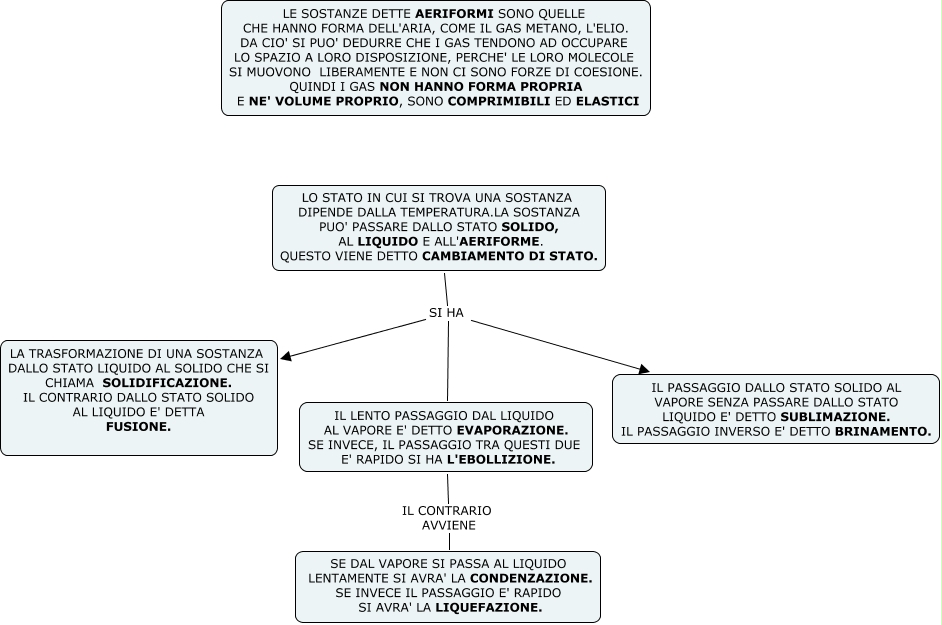 Questa Cmap, creata con IHMC CmapTools, contiene informazioni relative a: AERIFORMI E CAMBIAMENTI DI STATO PAG 45 A 48, IL LENTO PASSAGGIO DAL LIQUIDO AL VAPORE E' DETTO EVAPORAZIONE. SE INVECE, IL PASSAGGIO TRA QUESTI DUE E' RAPIDO SI HA L'EBOLLIZIONE. IL CONTRARIO AVVIENE SE DAL VAPORE SI PASSA AL LIQUIDO LENTAMENTE SI AVRA' LA CONDENZAZIONE. SE INVECE IL PASSAGGIO E' RAPIDO SI AVRA' LA LIQUEFAZIONE., LO STATO IN CUI SI TROVA UNA SOSTANZA DIPENDE DALLA TEMPERATURA.LA SOSTANZA PUO' PASSARE DALLO STATO SOLIDO, AL LIQUIDO E ALL'AERIFORME. QUESTO VIENE DETTO CAMBIAMENTO DI STATO. SI HA IL PASSAGGIO DALLO STATO SOLIDO AL VAPORE SENZA PASSARE DALLO STATO LIQUIDO E' DETTO SUBLIMAZIONE. IL PASSAGGIO INVERSO E' DETTO BRINAMENTO., LO STATO IN CUI SI TROVA UNA SOSTANZA DIPENDE DALLA TEMPERATURA.LA SOSTANZA PUO' PASSARE DALLO STATO SOLIDO, AL LIQUIDO E ALL'AERIFORME. QUESTO VIENE DETTO CAMBIAMENTO DI STATO. SI HA LA TRASFORMAZIONE DI UNA SOSTANZA DALLO STATO LIQUIDO AL SOLIDO CHE SI CHIAMA SOLIDIFICAZIONE. IL CONTRARIO DALLO STATO SOLIDO AL LIQUIDO E' DETTA FUSIONE., LO STATO IN CUI SI TROVA UNA SOSTANZA DIPENDE DALLA TEMPERATURA.LA SOSTANZA PUO' PASSARE DALLO STATO SOLIDO, AL LIQUIDO E ALL'AERIFORME. QUESTO VIENE DETTO CAMBIAMENTO DI STATO. SI HA IL LENTO PASSAGGIO DAL LIQUIDO AL VAPORE E' DETTO EVAPORAZIONE. SE INVECE, IL PASSAGGIO TRA QUESTI DUE E' RAPIDO SI HA L'EBOLLIZIONE.