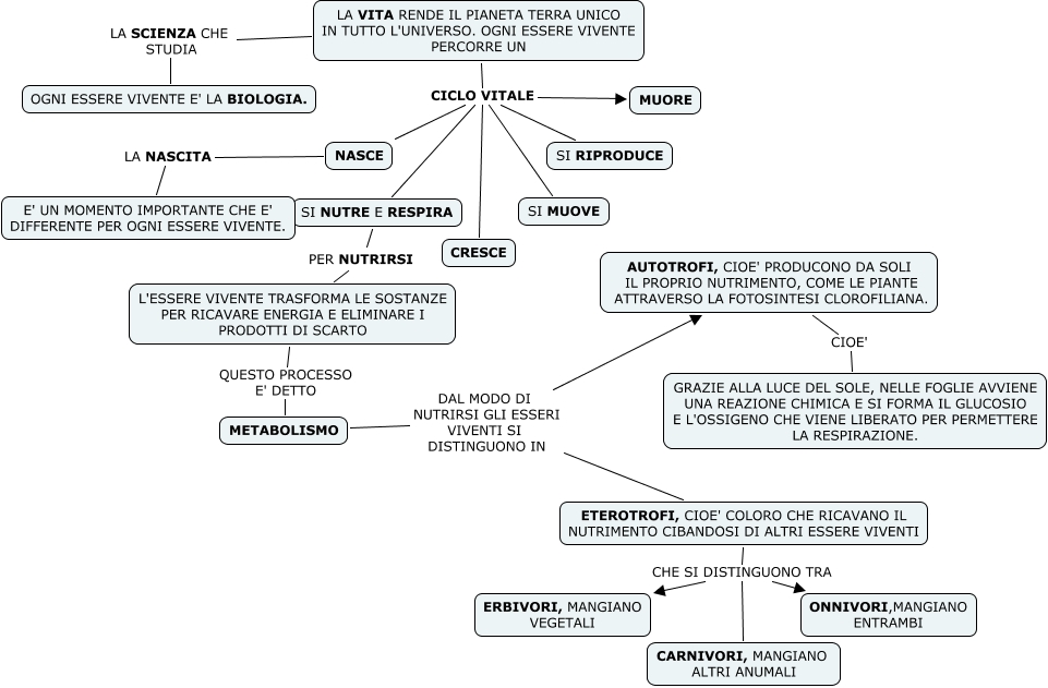 Questa Cmap, creata con IHMC CmapTools, contiene informazioni relative a: LA VITA PAG 4, 7, LA VITA RENDE IL PIANETA TERRA UNICO IN TUTTO L'UNIVERSO. OGNI ESSERE VIVENTE PERCORRE UN CICLO VITALE SI MUOVE, ETEROTROFI, CIOE' COLORO CHE RICAVANO IL NUTRIMENTO CIBANDOSI DI ALTRI ESSERE VIVENTI CHE SI DISTINGUONO TRA CARNIVORI, MANGIANO ALTRI ANUMALI, METABOLISMO DAL MODO DI NUTRIRSI GLI ESSERI VIVENTI SI DISTINGUONO IN ETEROTROFI, CIOE' COLORO CHE RICAVANO IL NUTRIMENTO CIBANDOSI DI ALTRI ESSERE VIVENTI, LA VITA RENDE IL PIANETA TERRA UNICO IN TUTTO L'UNIVERSO. OGNI ESSERE VIVENTE PERCORRE UN CICLO VITALE SI NUTRE E RESPIRA, LA VITA RENDE IL PIANETA TERRA UNICO IN TUTTO L'UNIVERSO. OGNI ESSERE VIVENTE PERCORRE UN CICLO VITALE MUORE, AUTOTROFI, CIOE' PRODUCONO DA SOLI IL PROPRIO NUTRIMENTO, COME LE PIANTE ATTRAVERSO LA FOTOSINTESI CLOROFILIANA. CIOE' GRAZIE ALLA LUCE DEL SOLE, NELLE FOGLIE AVVIENE UNA REAZIONE CHIMICA E SI FORMA IL GLUCOSIO E L'OSSIGENO CHE VIENE LIBERATO PER PERMETTERE LA RESPIRAZIONE., LA VITA RENDE IL PIANETA TERRA UNICO IN TUTTO L'UNIVERSO. OGNI ESSERE VIVENTE PERCORRE UN CICLO VITALE SI RIPRODUCE, NASCE LA NASCITA E' UN MOMENTO IMPORTANTE CHE E' DIFFERENTE PER OGNI ESSERE VIVENTE., ETEROTROFI, CIOE' COLORO CHE RICAVANO IL NUTRIMENTO CIBANDOSI DI ALTRI ESSERE VIVENTI CHE SI DISTINGUONO TRA ONNIVORI,MANGIANO ENTRAMBI, LA VITA RENDE IL PIANETA TERRA UNICO IN TUTTO L'UNIVERSO. OGNI ESSERE VIVENTE PERCORRE UN CICLO VITALE NASCE, SI NUTRE E RESPIRA PER NUTRIRSI L'ESSERE VIVENTE TRASFORMA LE SOSTANZE PER RICAVARE ENERGIA E ELIMINARE I PRODOTTI DI SCARTO, L'ESSERE VIVENTE TRASFORMA LE SOSTANZE PER RICAVARE ENERGIA E ELIMINARE I PRODOTTI DI SCARTO QUESTO PROCESSO E' DETTO METABOLISMO, LA VITA RENDE IL PIANETA TERRA UNICO IN TUTTO L'UNIVERSO. OGNI ESSERE VIVENTE PERCORRE UN LA SCIENZA CHE STUDIA OGNI ESSERE VIVENTE E' LA BIOLOGIA., METABOLISMO DAL MODO DI NUTRIRSI GLI ESSERI VIVENTI SI DISTINGUONO IN AUTOTROFI, CIOE' PRODUCONO DA SOLI IL PROPRIO NUTRIMENTO, COME LE PIANTE ATTRAVERSO LA FOTOSINTESI CLOROFILIANA., LA VITA RENDE IL PIANETA TERRA UNICO IN TUTTO L'UNIVERSO. OGNI ESSERE VIVENTE PERCORRE UN CICLO VITALE CRESCE, ETEROTROFI, CIOE' COLORO CHE RICAVANO IL NUTRIMENTO CIBANDOSI DI ALTRI ESSERE VIVENTI CHE SI DISTINGUONO TRA ERBIVORI, MANGIANO VEGETALI