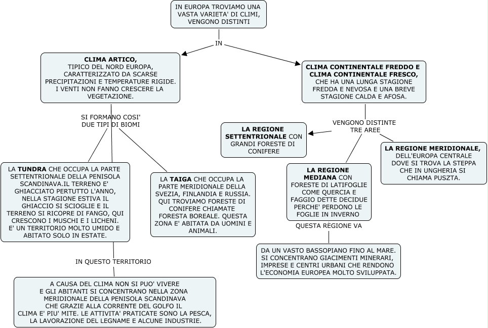 Questa Cmap, creata con IHMC CmapTools, contiene informazioni relative a: L'AREA NORDICA E L'AREA CONTINENTALE, CLIMA ARTICO, TIPICO DEL NORD EUROPA, CARATTERIZZATO DA SCARSE PRECIPITAZIONI E TEMPERATURE RIGIDE. I VENTI NON FANNO CRESCERE LA VEGETAZIONE. SI FORMANO COSI' DUE TIPI DI BIOMI LA TUNDRA CHE OCCUPA LA PARTE SETTENTRIONALE DELLA PENISOLA SCANDINAVA.IL TERRENO E' GHIACCIATO PERTUTTO L'ANNO, NELLA STAGIONE ESTIVA IL GHIACCIO SI SCIOGLIE E IL TERRENO SI RICOPRE DI FANGO, QUI CRESCONO I MUSCHI E I LICHENI. E' UN TERRITORIO MOLTO UMIDO E ABITATO SOLO IN ESTATE., IN EUROPA TROVIAMO UNA VASTA VARIETA' DI CLIMI, VENGONO DISTINTI IN CLIMA ARTICO, TIPICO DEL NORD EUROPA, CARATTERIZZATO DA SCARSE PRECIPITAZIONI E TEMPERATURE RIGIDE. I VENTI NON FANNO CRESCERE LA VEGETAZIONE., CLIMA ARTICO, TIPICO DEL NORD EUROPA, CARATTERIZZATO DA SCARSE PRECIPITAZIONI E TEMPERATURE RIGIDE. I VENTI NON FANNO CRESCERE LA VEGETAZIONE. SI FORMANO COSI' DUE TIPI DI BIOMI LA TAIGA CHE OCCUPA LA PARTE MERIDIONALE DELLA SVEZIA, FINLANDIA E RUSSIA. QUI TROVIAMO FORESTE DI CONIFERE CHIAMATE FORESTA BOREALE. QUESTA ZONA E' ABITATA DA UOMINI E ANIMALI., IN EUROPA TROVIAMO UNA VASTA VARIETA' DI CLIMI, VENGONO DISTINTI IN CLIMA CONTINENTALE FREDDO E CLIMA CONTINENTALE FRESCO, CHE HA UNA LUNGA STAGIONE FREDDA E NEVOSA E UNA BREVE STAGIONE CALDA E AFOSA., LA REGIONE MEDIANA CON FORESTE DI LATIFOGLIE COME QUERCIA E FAGGIO DETTE DECIDUE PERCHE' PERDONO LE FOGLIE IN INVERNO QUESTA REGIONE VA DA UN VASTO BASSOPIANO FINO AL MARE. SI CONCENTRANO GIACIMENTI MINERARI, IMPRESE E CENTRI URBANI CHE RENDONO L'ECONOMIA EUROPEA MOLTO SVILUPPATA., CLIMA CONTINENTALE FREDDO E CLIMA CONTINENTALE FRESCO, CHE HA UNA LUNGA STAGIONE FREDDA E NEVOSA E UNA BREVE STAGIONE CALDA E AFOSA. VENGONO DISTINTE TRE AREE LA REGIONE SETTENTRIONALE CON GRANDI FORESTE DI CONIFERE, CLIMA CONTINENTALE FREDDO E CLIMA CONTINENTALE FRESCO, CHE HA UNA LUNGA STAGIONE FREDDA E NEVOSA E UNA BREVE STAGIONE CALDA E AFOSA. VENGONO DISTINTE TRE AREE LA REGIONE MEDIANA CON FORESTE DI LATIFOGLIE COME QUERCIA E FAGGIO DETTE DECIDUE PERCHE' PERDONO LE FOGLIE IN INVERNO, CLIMA ARTICO, TIPICO DEL NORD EUROPA, CARATTERIZZATO DA SCARSE PRECIPITAZIONI E TEMPERATURE RIGIDE. I VENTI NON FANNO CRESCERE LA VEGETAZIONE. IN QUESTO TERRITORIO A CAUSA DEL CLIMA NON SI PUO' VIVERE E GLI ABITANTI SI CONCENTRANO NELLA ZONA MERIDIONALE DELLA PENISOLA SCANDINAVA CHE GRAZIE ALLA CORRENTE DEL GOLFO IL CLIMA E' PIU' MITE. LE ATTIVITA' PRATICATE SONO LA PESCA, LA LAVORAZIONE DEL LEGNAME E ALCUNE INDUSTRIE., CLIMA CONTINENTALE FREDDO E CLIMA CONTINENTALE FRESCO, CHE HA UNA LUNGA STAGIONE FREDDA E NEVOSA E UNA BREVE STAGIONE CALDA E AFOSA. VENGONO DISTINTE TRE AREE LA REGIONE MERIDIONALE, DELL'EUROPA CENTRALE DOVE SI TROVA LA STEPPA CHE IN UNGHERIA SI CHIAMA PUSZTA.
