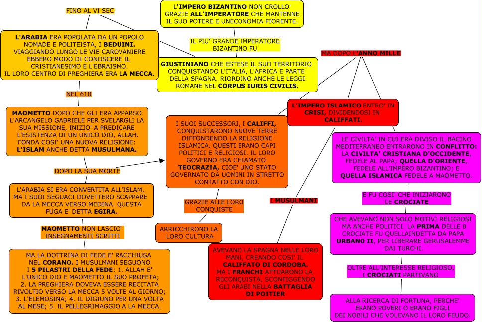 Questa Cmap, creata con IHMC CmapTools, contiene informazioni relative a: L'ESPANSIONE ISLAMICA, L'IMPERO BIZANTINO NON CROLLO' GRAZIE ALL'IMPERATORE CHE MANTENNE IL SUO POTERE E UNECONOMIA FIORENTE. IL PIU' GRANDE IMPERATORE BIZANTINO FU GIUSTINIANO CHE ESTESE IL SUO TERRITORIO CONQUISTANDO L'ITALIA, L'AFRICA E PARTE DELLA SPAGNA. RIORDINO ANCHE LE LEGGI ROMANE NEL CORPUS IURIS CIVILIS., L'ARABIA SI ERA CONVERTITA ALL'ISLAM, MA I SUOI SEGUACI DOVETTERO SCAPPARE DA LA MECCA VERSO MEDINA. QUESTA FUGA E' DETTA EGIRA. MAOMETTO NON LASCIO' INSEGNAMENTI SCRITTI MA LA DOTTRINA DI FEDE E' RACCHIUSA NEL CORANO. I MUSULMANI SEGUONO I 5 PILASTRI DELLA FEDE: 1. ALLAH E' L'UNICO DIO E MAOMETTO IL SUO PROFETA; 2. LA PREGHIERA DOVEVA ESSERE RECITATA RIVOLTIO VERSO LA MECCA 5 VOLTE AL GIORNO; 3. L'ELEMOSINA; 4. IL DIGIUNO PER UNA VOLTA AL MESE; 5. IL PELLEGRIMAGGIO A LA MECCA., L'ARABIA ERA POPOLATA DA UN POPOLO NOMADE E POLITEISTA, I BEDUINI. VIAGGIANDO LUNGO LE VIE CAROVANIERE EBBERO MODO DI CONOSCERE IL CRISTIANESIMO E L'EBRAISMO. IL LORO CENTRO DI PREGHIERA ERA LA MECCA. NEL 610 MAOMETTO DOPO CHE GLI ERA APPARSO L'ARCANGELO GABRIELE PER SVELARGLI LA SUA MISSIONE, INIZIO' A PREDICARE L'ESISTENZA DI UN UNICO DIO, ALLAH. FONDA COSI' UNA NUOVA RELIGIONE: L'ISLAM ANCHE DETTA MUSULMANA., L'IMPERO ISLAMICO ENTRO' IN CRISI, DIVIDENDOSI IN CALIFFATI. I MUSULMANI AVEVANO LA SPAGNA NELLE LORO MANI, CREANDO COSI' IL CALIFFATO DI CORDOBA. MA I FRANCHI ATTUARONO LA RECONQUISTA, SCONFIGGENDO GLI ARABI NELLA BATTAGLIA DI POITIER, GIUSTINIANO CHE ESTESE IL SUO TERRITORIO CONQUISTANDO L'ITALIA, L'AFRICA E PARTE DELLA SPAGNA. RIORDINO ANCHE LE LEGGI ROMANE NEL CORPUS IURIS CIVILIS. FINO AL VI SEC L'ARABIA ERA POPOLATA DA UN POPOLO NOMADE E POLITEISTA, I BEDUINI. VIAGGIANDO LUNGO LE VIE CAROVANIERE EBBERO MODO DI CONOSCERE IL CRISTIANESIMO E L'EBRAISMO. IL LORO CENTRO DI PREGHIERA ERA LA MECCA., CHE AVEVANO NON SOLO MOTIVI RELIGIOSI MA ANCHE POLITICI. LA PRIMA DELLE 8 CROCIATE FU QUELLAINDETTA DA PAPA URBANO II, PER LIBERARE GERUSALEMME DAI TURCHI. OLTRE ALL'INTERESSE RELIGIOSO, I CROCIATI PARTIVANO ALLA RICERCA DI FORTUNA, PERCHE' ERANO POVERI O ERANO FIGLI DEI NOBILI CHE VOLEVANO IL LORO FEUDO., LE CIVILTA' IN CUI ERA DIVISO IL BACINO MEDITERRANEO ENTRARONO IN CONFLITTO: LA CIVILTA' CRISTIANA D'OCCIDENTE, FEDELE AL PAPA; QUELLA D'ORIENTE, FEDELE ALL'IMPERO BIZANTINO; E QUELLA ISLAMICA FEDELE A MAOMETTO. E FU COSI' CHE INIZIARONO LE CROCIATE CHE AVEVANO NON SOLO MOTIVI RELIGIOSI MA ANCHE POLITICI. LA PRIMA DELLE 8 CROCIATE FU QUELLAINDETTA DA PAPA URBANO II, PER LIBERARE GERUSALEMME DAI TURCHI., MAOMETTO DOPO CHE GLI ERA APPARSO L'ARCANGELO GABRIELE PER SVELARGLI LA SUA MISSIONE, INIZIO' A PREDICARE L'ESISTENZA DI UN UNICO DIO, ALLAH. FONDA COSI' UNA NUOVA RELIGIONE: L'ISLAM ANCHE DETTA MUSULMANA. DOPO LA SUA MORTE L'ARABIA SI ERA CONVERTITA ALL'ISLAM, MA I SUOI SEGUACI DOVETTERO SCAPPARE DA LA MECCA VERSO MEDINA. QUESTA FUGA E' DETTA EGIRA., I SUOI SUCCESSORI, I CALIFFI, CONQUISTARONO NUOVE TERRE DIFFONDENDO LA RELIGIONE ISLAMICA. QUESTI ERANO CAPI POLITICI E RELIGIOSI. IL LORO GOVERNO ERA CHIAMATO TEOCRAZIA, CIOE' UNO STATO GOVERNATO DA UOMINI IN STRETTO CONTATTO CON DIO. MA DOPO L'ANNO MILLE L'IMPERO ISLAMICO ENTRO' IN CRISI, DIVIDENDOSI IN CALIFFATI., I SUOI SUCCESSORI, I CALIFFI, CONQUISTARONO NUOVE TERRE DIFFONDENDO LA RELIGIONE ISLAMICA. QUESTI ERANO CAPI POLITICI E RELIGIOSI. IL LORO GOVERNO ERA CHIAMATO TEOCRAZIA, CIOE' UNO STATO GOVERNATO DA UOMINI IN STRETTO CONTATTO CON DIO. GRAZIE ALLE LORO CONQUISTE ARRICCHIRONO LA LORO CULTURA, MAOMETTO DOPO CHE GLI ERA APPARSO L'ARCANGELO GABRIELE PER SVELARGLI LA SUA MISSIONE, INIZIO' A PREDICARE L'ESISTENZA DI UN UNICO DIO, ALLAH. FONDA COSI' UNA NUOVA RELIGIONE: L'ISLAM ANCHE DETTA MUSULMANA. DOPO LA SUA MORTE I SUOI SUCCESSORI, I CALIFFI, CONQUISTARONO NUOVE TERRE DIFFONDENDO LA RELIGIONE ISLAMICA. QUESTI ERANO CAPI POLITICI E RELIGIOSI. IL LORO GOVERNO ERA CHIAMATO TEOCRAZIA, CIOE' UNO STATO GOVERNATO DA UOMINI IN STRETTO CONTATTO CON DIO., LE CIVILTA' IN CUI ERA DIVISO IL BACINO MEDITERRANEO ENTRARONO IN CONFLITTO: LA CIVILTA' CRISTIANA D'OCCIDENTE, FEDELE AL PAPA; QUELLA D'ORIENTE, FEDELE ALL'IMPERO BIZANTINO; E QUELLA ISLAMICA FEDELE A MAOMETTO. MA DOPO L'ANNO MILLE L'IMPERO ISLAMICO ENTRO' IN CRISI, DIVIDENDOSI IN CALIFFATI.