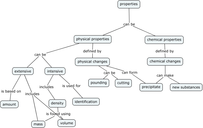 This Concept Map, created with IHMC CmapTools, has information related to: properties, density is found using volume, physical changes can be pounding, properties can be chemical properties, density is found using mass, extensive includes volume, extensive includes mass, chemical properties defined by chemical changes, intensive includes density, physical changes can form precipitate, chemical changes can make precipitate, physical properties defined by physical changes, physical changes can be cutting, chemical changes can make new substances, extensive is based on amount, intensive is used for identification, physical properties can be extensive, physical properties can be intensive, properties can be physical properties