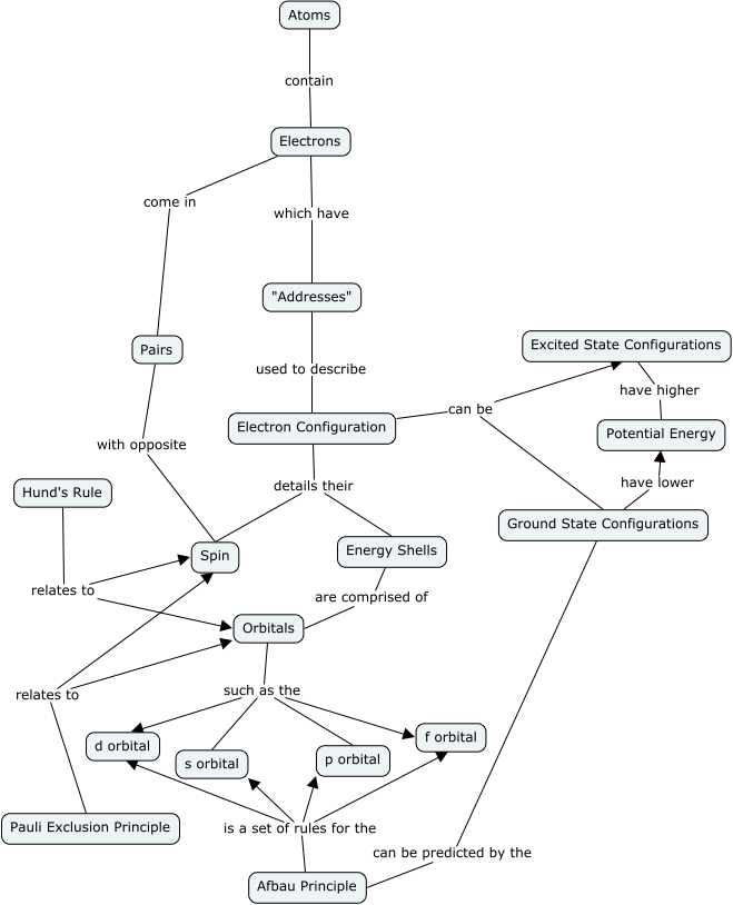 This Concept Map, created with IHMC CmapTools, has information related to: Electron Configuration, Orbitals such as the f orbital, Afbau Principle is a set of rules for the f orbital, "Addresses" used to describe Electron Configuration, Orbitals such as the p orbital, Ground State Configurations have lower Potential Energy, Ground State Configurations can be predicted by the Afbau Principle, Electron Configuration can be Ground State Configurations, Orbitals such as the s orbital, Energy Shells are comprised of Orbitals, Hund's Rule relates to Spin, Electrons which have "Addresses", Electron Configuration can be Excited State Configurations, Orbitals such as the d orbital, Afbau Principle is a set of rules for the p orbital, Pauli Exclusion Principle relates to Orbitals, Hund's Rule relates to Orbitals, Excited State Configurations have higher Potential Energy, Afbau Principle is a set of rules for the s orbital, Electron Configuration details their Energy Shells, Electron Configuration details their Spin