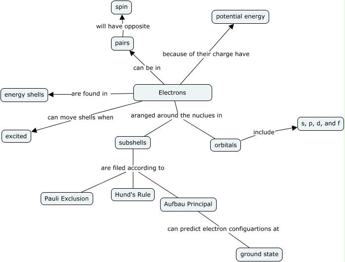 This Concept Map, created with IHMC CmapTools, has information related to: Electron Configuration, subshells are filed according to Hund's Rule, Electrons aranged around the nuclues in orbitals, Electrons are found in energy shells, pairs will have opposite spin, Electrons aranged around the nuclues in subshells, subshells are filed according to Aufbau Principal, Electrons can be in pairs, Electrons can move shells when excited, subshells are filed according to Pauli Exclusion, Aufbau Principal can predict electron configuartions at ground state, orbitals include s, p, d, and f, Electrons because of their charge have potential energy