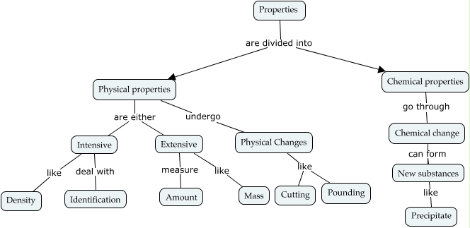 This Concept Map, created with IHMC CmapTools, has information related to: Chem. Properties, Properties are divided into Chemical properties, Physical Changes like Pounding, Physical properties are either Extensive, Chemical properties go through Chemical change, Extensive measure Amount, Intensive deal with Identification, Chemical change can form New substances, Cutting like Pounding, Extensive like Mass, Intensive like Density, Physical properties are either Intensive, New substances like Precipitate, Properties are divided into Physical properties, Physical properties undergo Physical Changes