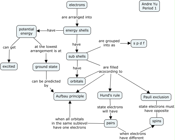 This Concept Map, created with IHMC CmapTools, has information related to: Electron Configuration, ground state can be predicted by Aufbau principle, sub shells are grouped into as s p d f, orbitals are filled acocording to Hund's rule, energy shells have sub shells, orbitals are filled acocording to Aufbau principle, sub shells have orbitals, potential energy can get excited, electrons are arranged into energy shells, energy shells have potential energy, potential energy at the lowest arrangement is at ground state, sub shells are filled acocording to Pauli exclusion, orbitals are filled acocording to Pauli exclusion, sub shells are filled acocording to Aufbau principle, pairs when all orbitals in the same sublevel have one electrons Aufbau principle, Pauli exclusion state electrons must have opposite spins, Hund's rule state electrons will have pairs, sub shells are filled acocording to Hund's rule, pairs when electrons have different spins