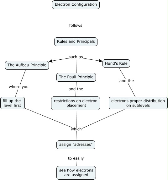 This Concept Map, created with IHMC CmapTools, has information related to: Electron configuration, Electron Configuration follows Rules and Principals, The Pauli Principle and the restrictions on electron placement, Rules and Principals such as Hund's Rule, Rules and Principals such as The Aufbau Principle, assign "adresses" to easily see how electrons are assigned, The Aufbau Principle where you fill up the level first, restrictions on electron placement which assign "adresses", Rules and Principals such as The Pauli Principle, electrons proper distribution on sublevels which assign "adresses", fill up the level first which assign "adresses", Hund's Rule and the electrons proper distribution on sublevels