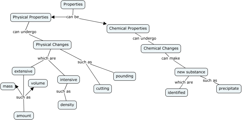 This Concept Map, created with IHMC CmapTools, has information related to: properties, Physical Properties can undergo Physical Changes, Physical Changes such as pounding, extensive such as mass, Physical Changes which are intensive, Chemical Changes can make new substance, Properties can be Chemical Properties, Physical Changes such as cutting, new substance which are identified, Physical Changes which are extensive, extensive such as amount, intensive such as density, Chemical Properties can undergo Chemical Changes, Properties can be Physical Properties, extensive such as volume, new substance such as precipitate
