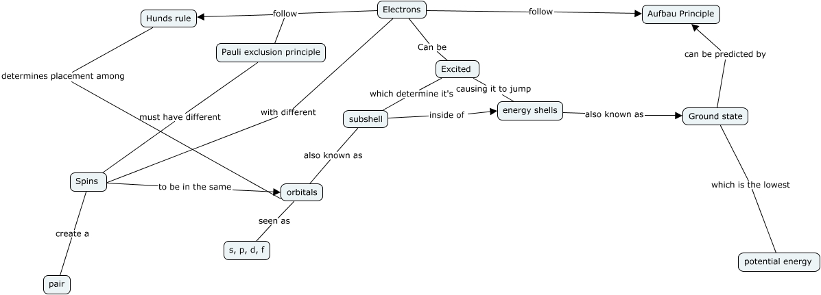 This Concept Map, created with IHMC CmapTools, has information related to: Electron Configuration, Spins create a pair, Electrons follow Aufbau Principle, Electrons with different Spins, subshell inside of energy shells, Spins to be in the same orbitals, Excited causing it to jump energy shells, Excited which determine it's subshell, subshell also known as orbitals, Electrons follow Pauli exclusion principle, energy shells also known as Ground state, Pauli exclusion principle must have different Spins, Electrons Can be Excited, Hunds rule determines placement among orbitals, orbitals seen as s, p, d, f, Electrons follow Hunds rule, Ground state which is the lowest potential energy, Ground state can be predicted by Aufbau Principle