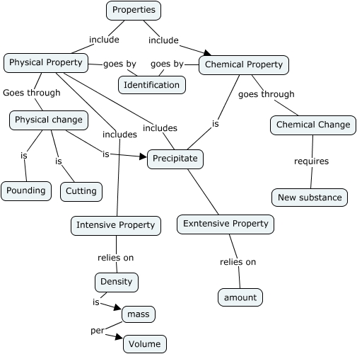This Concept Map, created with IHMC CmapTools, has information related to: Properties, Physical change is Cutting, Physical change is Pounding, Physical Property includes Intensive Property, Chemical Property is Precipitate, Density is mass, Properties include Physical Property, Chemical Change requires New substance, Physical change is Precipitate, Physical Property goes by Identification, Exntensive Property relies on amount, Chemical Property goes through Chemical Change, Properties include Chemical Property, Intensive Property relies on Density, Physical Property includes Exntensive Property, Physical Property Goes through Physical change, mass per Volume, Chemical Property goes by Identification