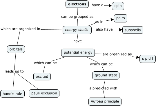 This Concept Map, created with IHMC CmapTools, has information related to: electron configuration, ground state is predicted with Aufbau principle, energy shells as in pairs, orbitals leads us to hund's rule, energy shells have potential energy, potential energy which can be ground state, energy shells also have subshells, energy shells which are organized in orbitals, potential energy which can be excited, electrons can be grouped as energy shells, orbitals leads us to pauli exclusion, electrons have a spin, potential energy are organized as s p d f