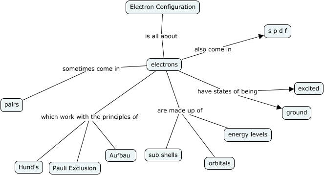 This Concept Map, created with IHMC CmapTools, has information related to: Electron Configuration, electrons which work with the principles of Pauli Exclusion, electrons sometimes come in pairs, electrons are made up of orbitals, electrons have states of being ground, electrons are made up of sub shells, electrons have states of being excited, electrons which work with the principles of Aufbau, electrons which work with the principles of Hund's, electrons also come in s p d f, electrons are made up of energy levels, Electron Configuration is all about electrons