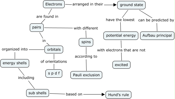 This Concept Map, created with IHMC CmapTools, has information related to: Electrons, sub shells based on Hund's rule, pairs in orbitals, potential energy with electrons that are not excited, ground state have the lowest potential energy, Electrons are found in pairs, orbitals organized into energy shells, Electrons arranged in their ground state, spins according to Pauli exclusion, orbitals of orientations s p d f, ground state can be predicted by Aufbau principal, pairs with different spins, energy shells including sub shells