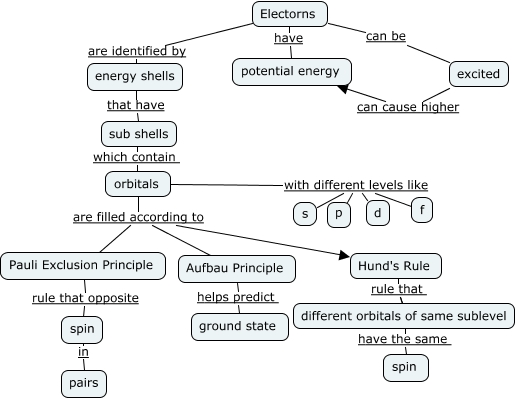 This Concept Map, created with IHMC CmapTools, has information related to: Electron Configuration, excited can cause higher potential energy, orbitals with different levels like f, Hund's Rule rule that different orbitals of same sublevel, orbitals are filled according to Pauli Exclusion Principle, Pauli Exclusion Principle rule that opposite spin, orbitals with different levels like d, Electorns can be excited, different orbitals of same sublevel have the same spin, spin in pairs, orbitals are filled according to Hund's Rule, Electorns are identified by energy shells, orbitals are filled according to Aufbau Principle, energy shells that have sub shells, orbitals with different levels like s, Aufbau Principle helps predict ground state, Hund's Rule rule that different orbitals of same sublevel, sub shells which contain orbitals, orbitals with different levels like p, Electorns have potential energy