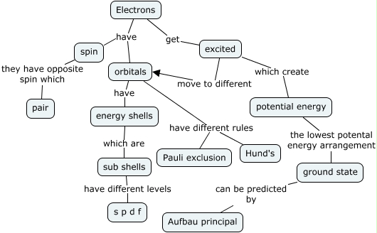 This Concept Map, created with IHMC CmapTools, has information related to: Electron Configuration, excited move to different orbitals, spin have orbitals, sub shells have different levels s p d f, Electrons have orbitals