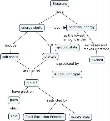 This Concept Map, created with IHMC CmapTools, has information related to: Electron Configurations, Electrons have potential energy, energy shells include sub shells, orbitals are named s p d f, potential energy increases and makes electrons excited, Electrons have energy shells, energy shells have potential energy, pairs which spin, ground state is predicted by Aufbau Principal, s p d f restricted by Pauli Exclusion Principle, s p d f restricted by Hund's Rule, potential energy at the lowest amount is the ground state, sub shells are named s p d f, energy shells are orbitals, s p d f have electron pairs