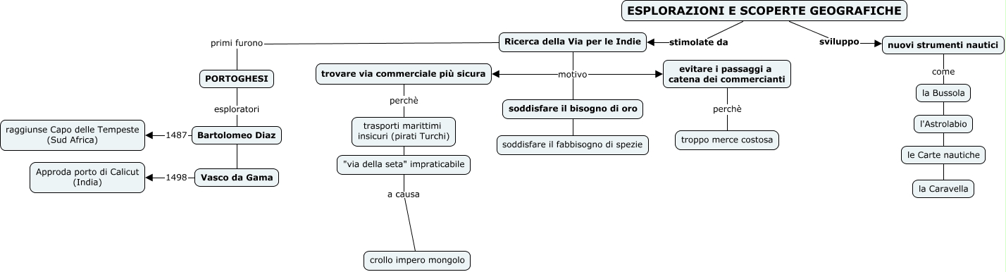 Questa Cmap, creata con IHMC CmapTools, contiene informazioni relative a: scoperte, trovare via commerciale più sicura perchè "via della seta" impraticabile, Bartolomeo Diaz 1487 raggiunse Capo delle Tempeste (Sud Africa), trovare via commerciale più sicura perchè trasporti marittimi insicuri (pirati Turchi), nuovi strumenti nautici come la Caravella, Ricerca della Via per le Indie motivo evitare i passaggi a catena dei commercianti, nuovi strumenti nautici come le Carte nautiche, ESPLORAZIONI E SCOPERTE GEOGRAFICHE stimolate da Ricerca della Via per le Indie, Ricerca della Via per le Indie motivo trovare via commerciale più sicura, PORTOGHESI esploratori Vasco da Gama, Ricerca della Via per le Indie primi furono PORTOGHESI, "via della seta" impraticabile a causa crollo impero mongolo, evitare i passaggi a catena dei commercianti perchè troppo merce costosa, Ricerca della Via per le Indie motivo soddisfare il fabbisogno di spezie, Vasco da Gama 1498 Approda porto di Calicut (India), PORTOGHESI esploratori Bartolomeo Diaz, ESPLORAZIONI E SCOPERTE GEOGRAFICHE sviluppo nuovi strumenti nautici, nuovi strumenti nautici come l'Astrolabio, Ricerca della Via per le Indie motivo soddisfare il bisogno di oro, nuovi strumenti nautici come la Bussola