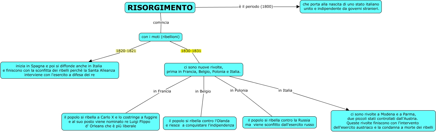 Questa Cmap, creata con IHMC CmapTools, contiene informazioni relative a: Risorgimento, con i moti (ribellioni) 1830-1831 ci sono nuove rivolte, prima in Francia, Belgio, Polonia e Italia., ci sono nuove rivolte, prima in Francia, Belgio, Polonia e Italia. in Belgio il popolo si ribella contro l'Olanda e riesce a conquistare l'indipendenza, ci sono nuove rivolte, prima in Francia, Belgio, Polonia e Italia. in Francia il popolo si ribella a Carlo X e lo costringe a fuggire e al suo posto viene nominato re Luigi Flippo d' Orleans che è più liberale, RISORGIMENTO è il periodo (1800) che porta alla nascita di uno stato italiano unito e indipendente da governi stranieri., ci sono nuove rivolte, prima in Francia, Belgio, Polonia e Italia. in Italia ci sono rivolte a Modena e a Parma, due piccoli stati controllati dall'Austria. Queste rivolte finiscono con l'intervento dell'esercito austriaco e la condanna a morte dei ribelli, RISORGIMENTO comincia con i moti (ribellioni), con i moti (ribellioni) 1820-1821 inizia in Spagna e poi si diffonde anche in Italia e finiscono con la sconfitta dei ribelli perchè la Santa Alleanza interviene con l'esercito a difesa dei re, ci sono nuove rivolte, prima in Francia, Belgio, Polonia e Italia. in Polonia il popolo si ribella contro la Russia ma viene sconfitto dall'esercito russo