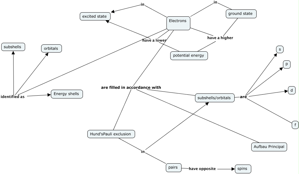 This Concept Map, created with IHMC CmapTools, has information related to: Electron Configuration, subshells/orbitals are s, Electrons have a lower potential energy, subshells/orbitals are filled in accordance with Hund's Pauli exclusion, Electrons are filled in accordance with Aufbau Principal, Electrons have a higher potential energy, subshells/orbitals are d, Electrons identified as orbitals, ground state have a higher potential energy, Electrons in ground state, Electrons in excited state, subshells/orbitals are f, subshells/orbitals are p, Hund's Pauli exclusion in subshells/orbitals, Electrons identified as subshells, pairs have opposite spins, Electrons are filled in accordance with Hund's Pauli exclusion, Electrons identified as Energy shells, Electrons have a lower excited state, Hund's Pauli exclusion in pairs, subshells/orbitals are filled in accordance with Aufbau Principal