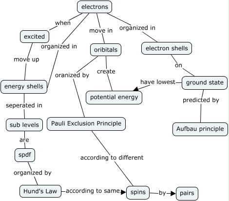 This Concept Map, created with IHMC CmapTools, has information related to: Electrom CMAP, ground state predicted by Aufbau principle, electrons organized in electron shells, spdf organized by Hund's Law, sub levels are spdf, electrons when excited, oribitals oranized by Pauli Exclusion Principle, oribitals create potential energy, electrons move in oribitals, Hund's Law according to same spins, excited move up energy shells, electrons organized in energy shells, ground state have lowest potential energy, Pauli Exclusion Principle according to different spins, electron shells on ground state, spins by pairs, energy shells seperated in sub levels