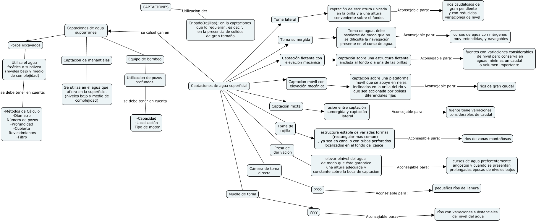 Este Cmap, tiene información relacionada con: 2 captacion, Toma sumergida Toma de agua, debe instalarse de modo que no se dificulte la navegación presente en el curso de agua., Toma de agua, debe instalarse de modo que no se dificulte la navegación presente en el curso de agua. Aconsejable para: cursos de agua con márgenes muy extendidas, y navegables, Captaciones de agua superficial Presa de derivación, Captaciones de agua superficial Toma de rejilla, captación de estructura ubicada en la orilla y a una altura conveniente sobre el fondo. Aconsejable para: ríos caudalosos de gran pendiente y con reducidas variaciones de nivel, Captaciones de agua superficial Captación móvil con elevación mecánica, Utiliza el agua freática o subálvea (niveles bajo y medio de complejidad) se debe tener en cuenta: -Métodos de Cálculo -Diámetro -Número de pozos -Profundidad -Cubierta -Revestimientos -Filtro, Captaciones de agua superficial Captación mixta, ???? Aconsejable para: ríos con variaciones substanciales del nivel del agua, Captaciones de agua supterranea Pozos excavados, Captaciones de agua superficial Captación flotante con elevación mecánica, fusion entre captación sumergida y captación lateral Aconsejable para: fuente tiene variaciones considerables de caudal, Captaciones de agua supterranea Captación de manantiales, captación sobre una plataforma móvil que se apoye en rieles inclinados en la orilla del río y que sea accionada por poleas diferenciales fijas Aconsejable para: ríos de gran caudal, Captación móvil con elevación mecánica captación sobre una plataforma móvil que se apoye en rieles inclinados en la orilla del río y que sea accionada por poleas diferenciales fijas, Captaciones de agua superficial Toma lateral, CAPTACIONES Utilizacion de: Cribado(rejillas); en la captaciones que lo requieran, es decir, en la presencia de solidos de gran tamaño., Captación de manantiales Se utiliza en el agua que aflora en la superficie. (niveles bajo y medio de complejidad), Cámara de toma directa ????, elevar elnivel del agua de modo que éste garantice una altura adecuada y constante sobre la boca de captación Aconsejable para: cursos de agua preferentemente angostos y cuando se presentan prolongadas épocas de niveles bajos