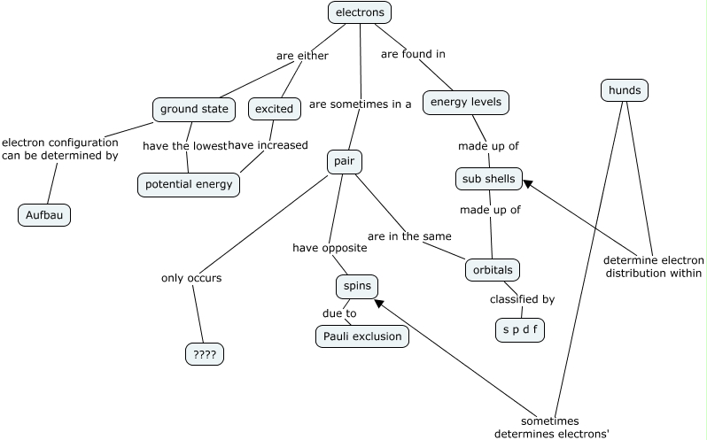 This Concept Map, created with IHMC CmapTools, has information related to: electron config, electrons are either ground state, energy levels made up of sub shells, orbitals classified by s p d f, excited have increased potential energy, electrons are either excited, ground state electron configuration can be determined by Aufbau, hunds determine electron distribution within sub shells, pair only occurs ????, pair have opposite spins, spins due to Pauli exclusion, electrons are sometimes in a pair, pair are in the same orbitals, sub shells made up of orbitals, hunds sometimes determines electrons' spins, electrons are found in energy levels, ground state have the lowest potential energy