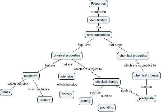 This Concept Map, created with IHMC CmapTools, has information related to: Properties, Properties require the identification, extensive which includes amount, physical properties that are extensive, new substances that have physical properties, physical properties which are subject to physical change, identification of a new substances, physical change such as precipitate, physical properties that are intensive, intensive which includes density, chemical properties which are subjective to chemical change, extensive which includes mass, physical change such as pounding, new substances that have chemical properties, chemical change such as precipitate, physical change such as cutting