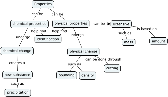 This Concept Map, created with IHMC CmapTools, has information related to: Properties, chemical properties undergo chemical change, extensive is based on amount, Properties can be physical properties, chemical properties help find identification, physical change such as density, new substance such as precipitation, chemical change creates a new substance, physical change can be done through cutting, extensive such as mass, Properties can be chemical properties, physical properties can be extensive, physical properties help find identification, physical change such as pounding, physical properties undergo physical change