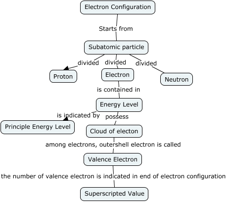 This Concept Map, created with IHMC CmapTools, has information related to: Electron configuration, Energy Level is indicated by Principle Energy Level, Subatomic particle divided Electron, Electron is contained in Energy Level, Electron Configuration Starts from Subatomic particle, Cloud of electon among electrons, outershell electron is called Valence Electron, Subatomic particle divided Proton, Valence Electron the number of valence electron is indicated in end of electron configuration Superscripted Value, Subatomic particle divided Neutron, Energy Level possess Cloud of electon
