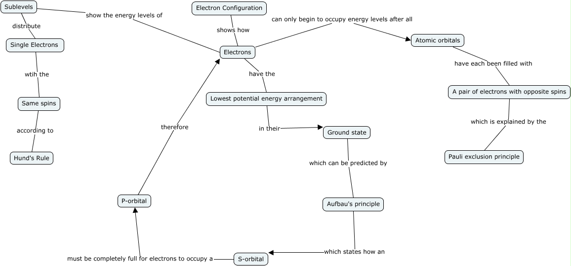This Concept Map, created with IHMC CmapTools, has information related to: Electron Configuration, Atomic orbitals have each been filled with A pair of electrons with opposite spins, Aufbau's principle which states how an S-orbital, P-orbital therefore Electrons, Electron Configuration shows how Electrons, Electrons can only begin to occupy energy levels after all Atomic orbitals, Sublevels distribute Single Electrons, Electrons have the Lowest potential energy arrangement, Same spins according to Hund's Rule, Single Electrons wtih the Same spins, Lowest potential energy arrangement in their Ground state, Sublevels show the energy levels of Electrons, A pair of electrons with opposite spins which is explained by the Pauli exclusion principle, S-orbital must be completely full for electrons to occupy a P-orbital, Ground state which can be predicted by Aufbau's principle