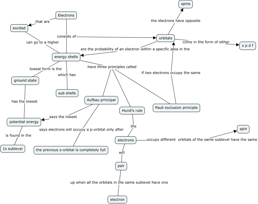 This Concept Map, created with IHMC CmapTools, has information related to: Electron configuration, Pauli exclusion principle if two electrons occupy the same orbitals, electrons occupy different orbitals of the same sublevel have the same spin, orbitals come in the form of either s p d f, energy shells lowest form is the ground state, electrons will pair, Hund's rule the electrons, energy shells have three principles called Aufbau principal, Electrons consists of energy shells, Electrons consists of orbitals, energy shells have three principles called Hund's rule, orbitals the electrons have opposite spins, orbitals are the probability of an electron within a specific area in the energy shells, pair up when all the orbitals in the same sublevel have one electron, excited can go to a higher energy shells, Aufbau principal says the lowest potential energy, ground state has the lowest potential energy, energy shells have three principles called Pauli exclusion principle, Aufbau principal says electrons will occupy a p-orbital only after the previous s-orbital is completely full, Electrons that are excited, energy shells which has sub shells