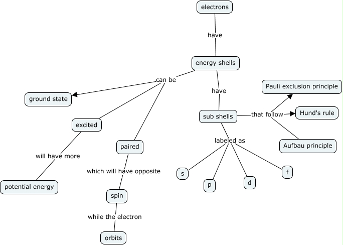 This Concept Map, created with IHMC CmapTools, has information related to: electron configuration, energy shells can be paired, energy shells can be ground state, paired which will have opposite spin, energy shells can be excited, electrons have energy shells, sub shells that follow Pauli exclusion principle, sub shells labeled as s, excited will have more potential energy, sub shells labeled as d, sub shells that follow Hund's rule, sub shells labeled as p, sub shells that follow Aufbau principle, energy shells have sub shells, sub shells labeled as f, spin while the electron orbits