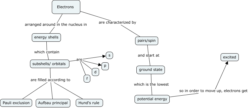This Concept Map, created with IHMC CmapTools, has information related to: Electron Configuration, potential energy so in order to move up, electrons get excited, Electrons are characterized by pairs/spin, energy shells which contain subshells/ orbitals, subshells/ orbitals are p, subshells/ orbitals are f, Electrons arranged around in the nucleus in energy shells, subshells/ orbitals are filled according to Aufbau principal, subshells/ orbitals are s, ground state which is the lowest potential energy, subshells/ orbitals are d, subshells/ orbitals are filled according to Hund's rule, subshells/ orbitals are filled according to Pauli exclusion, pairs/spin and start at ground state