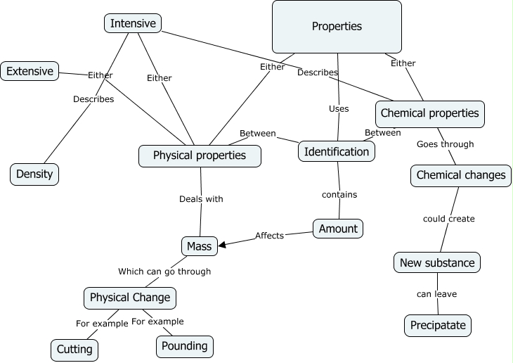 This Concept Map, created with IHMC CmapTools, has information related to: properties, Chemical properties Goes through Chemical changes, New substance can leave Precipatate, Physical Change For example Cutting, Chemical changes could create New substance, Intensive Describes Density, Extensive Either Physical properties, Amount Affects Mass, Mass Which can go through Physical Change, Physical Change For example Pounding, Properties Uses Identification, Identification contains Amount, Intensive Describes Chemical properties, Identification Between Chemical properties, Properties Either Physical properties, Properties Either Chemical properties, Intensive Either Physical properties, Physical properties Deals with Mass, Identification Between Physical properties
