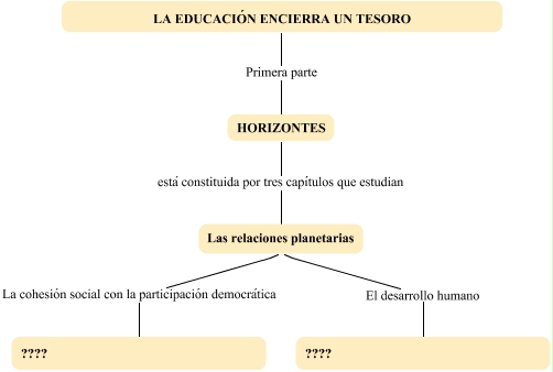 Este Cmap, tiene información relacionada con: PRIMERA PARTE- HORIZONTE, LA EDUCACIÓN ENCIERRA UN TESORO Primera parte HORIZONTES, HORIZONTES está constituida por tres capítulos que estudian Las relaciones planetarias, Las relaciones planetarias El desarrollo humano ????, Las relaciones planetarias La cohesión social con la participación democrática ????