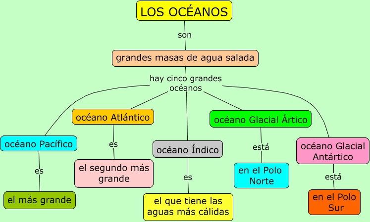 Este Cmap, tiene información relacionada con: Los océanos, océano Glacial Ártico está en el Polo Norte, grandes masas de agua salada hay cinco grandes océanos océano Atlántico, LOS OCÉANOS son grandes masas de agua salada, océano Glacial Antártico está en el Polo Sur, océano Índico es el que tiene las aguas más cálidas, grandes masas de agua salada hay cinco grandes océanos océano Índico, océano Atlántico es el segundo más grande, grandes masas de agua salada hay cinco grandes océanos océano Glacial Ártico, grandes masas de agua salada hay cinco grandes océanos océano Pacífico, grandes masas de agua salada hay cinco grandes océanos océano Glacial Antártico, océano Pacífico es el más grande