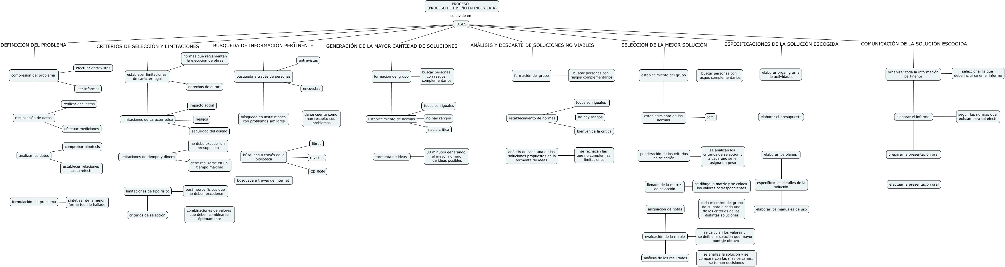 Este Cmap, tiene información relacionada con: D.I 1, todos son iguales ???? Establecimiento de normas, búsqueda a través de personas ???? búsqueda en instituciones con problemas similares, FASES COMUNICACIÓN DE LA SOLUCIÓN ESCOGIDA organizar toda la información pertinente, establecimiento de las normas ???? ponderación de los criterios de selección, búsqueda en instituciones con problemas similares ???? búsqueda a través de la biblioteca, limitaciones de carácter ético ???? limitaciones de tiempo y dinero, normas que reglamentan la ejecución de obras ???? establecer limitaciones de carácter legal, limitaciones de tiempo y dinero ???? limitaciones de tipo físico, elaborar el presupuesto ???? elaborar los planos, recopilación de datos ???? efectuar mediciones, todos son iguales ???? establecimiento de normas, FASES DEFINICIÓN DEL PROBLEMA compresión del problema, FASES BÚSQUEDA DE INFORMACIÓN PERTINENTE búsqueda a través de personas, revistas ???? búsqueda a través de la biblioteca, asignación de notas ???? evaluación de la matriz, encuestas ???? búsqueda a través de personas, Establecimiento de normas ???? tormenta de ideas, establecer relaciones causa-efecto ???? analizar los datos, PROCESO 1 (PROCESO DE DISEÑO EN INGENIER�?A) se divide en FASES, elaborar los planos ???? especificar los detalles de la solución